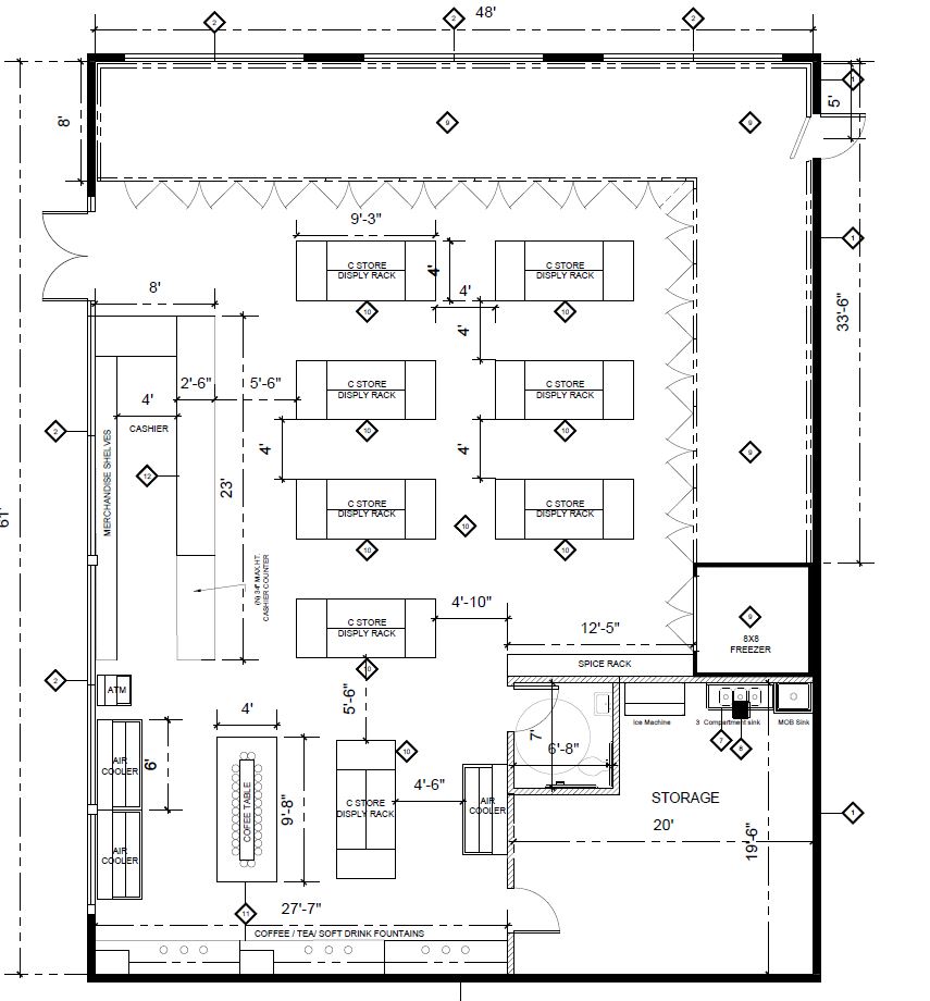 create a detailed interior rendering of a modern liquor store floor plan with a welcoming and organized atmosphere the space includes several display racks shelving units a cashier area and coolers use a warm inviting color palette with soft beige and cream walls polished light oak wood for the flooring and contemporary metallic fixtures in silver the display racks and shelving should be a sleek charcoal gray while the cashier counter is in a brushed aluminum finish use vibrant accent colors like deep red or blue for signage to add contrast the lighting is bright and even creating an open clean and well organized atmosphere there should be clear pathways between the racks and the seating area near the entrance which features comfortable seating with dark teal cushions the refrigeration units at the back have clear glass doors and the freezer in the corner is subtly integrated into the design with frosted glass panels the overall ambiance is bustling yet cozy with a focus on customer convenience and easy navigation architecture