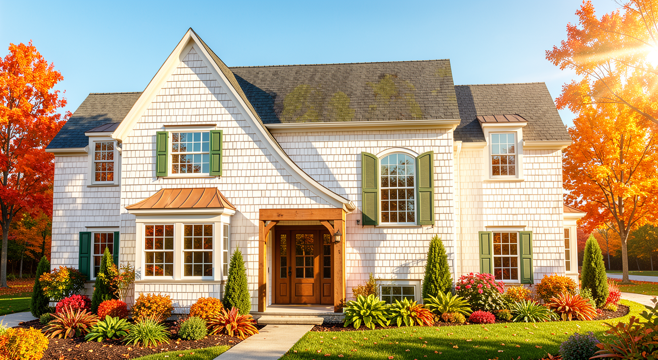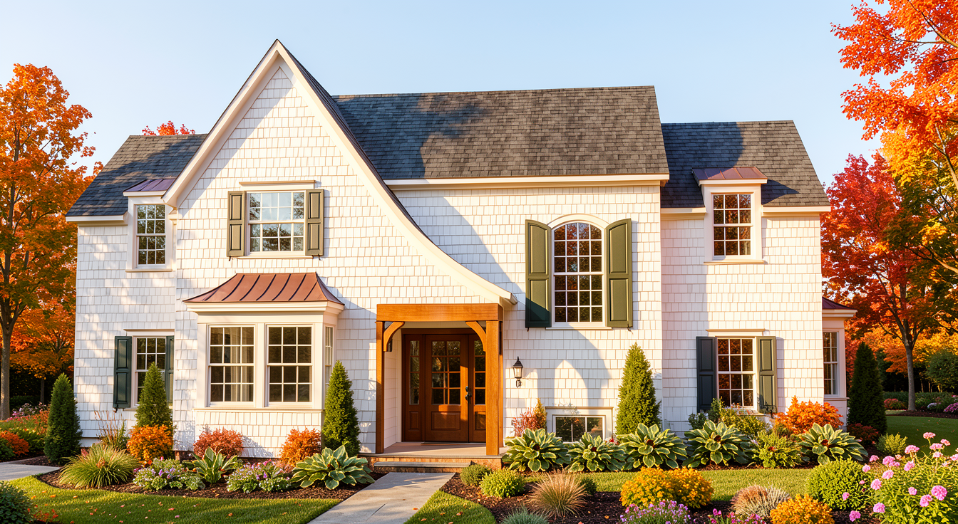 fall bright warm white shingle siding with full landscaping