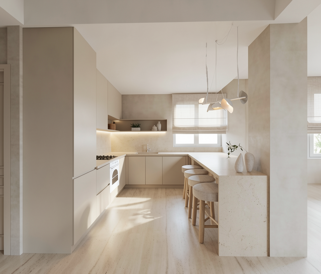 create a highly realistic render of a modern kitchen in a coastal home with a calm warm and refined atmosphere the design is minimal and cohesive inspired by seaside living with a soft neutral palette that evokes natural light sand tones and a relaxed elegance the kitchen layout is linear with an l shaped extension featuring clean handle less cabinetry in a light beige tone with a matte finish the surfaces appear smooth and seamless the countertop and backsplash are in a natural light beige stone reminiscent of sand and coastal textures with subtle variations and a soft matte finish a hidden led strip is installed beneath the upper cabinets providing soft indirect lighting that gently illuminates the backsplash and enhances the warm ambient atmosphere in the foreground there is an extended kitchen island or bar with a monolithic appearance in the same light beige stone material in front of the island there are bar stools with light oak wooden legs and a natural finish the seats are upholstered in a soft light beige linen fabric adding a breathable coastal character at the back a window allows soft natural light to enter the space filtered through a light fabric roman shade in a neutral tone reinforcing the relaxed seaside feeling the walls are finished in light beige microcement and the flooring is in a light natural tone enhancing the airy and serene coastal atmosphere the overall lighting is soft and diffused combining natural light with hidden led lighting creating minimal shadows and a warm inviting high end coastal ambiance ultra realistic render high resolution premium materials coastal interior design interior design magazine photography style style elegant and minimal the shelves on the kitchen n above the kitchen island there is a suspended light of thin white ropes add to the shelves of the kitchen two decors minimal and elegant the oven is white