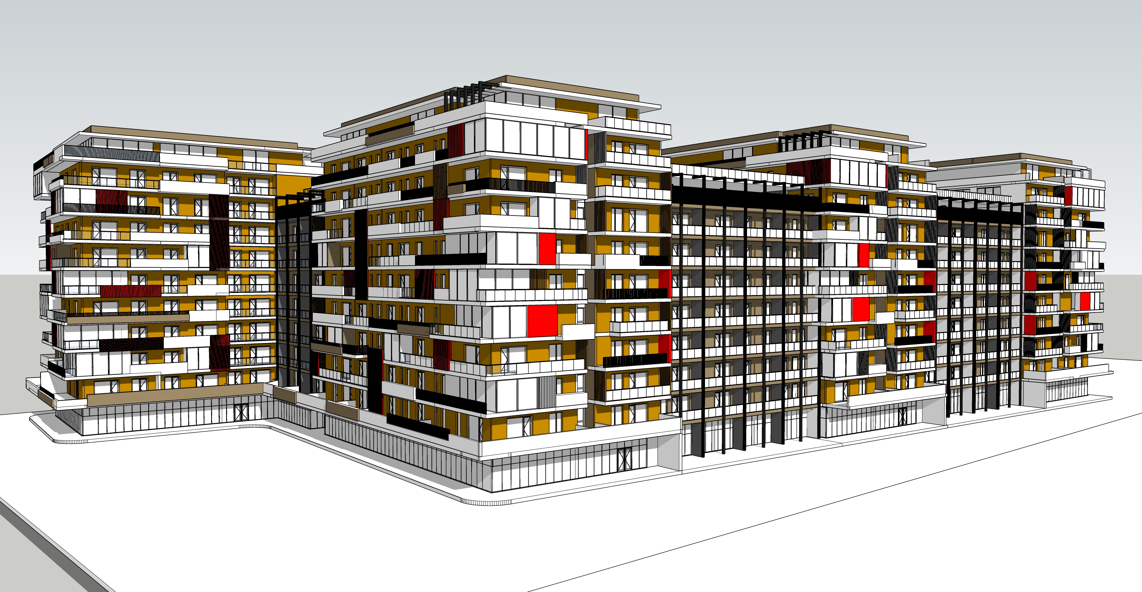 where is red i want perforated bricks in copper colour where is yellow i want fluted panels in natural oak colour where is green i want a cappuccino colour balconies are white near a park city lights in the back rails are black window frames are dark grey turn on the streetlights and the lights from the cars perforated brick walls are lighted from behind led stripe at the upper level all arround in the front put some alleys with new vegetation in front change the green from the facade with cappucino in the early morning