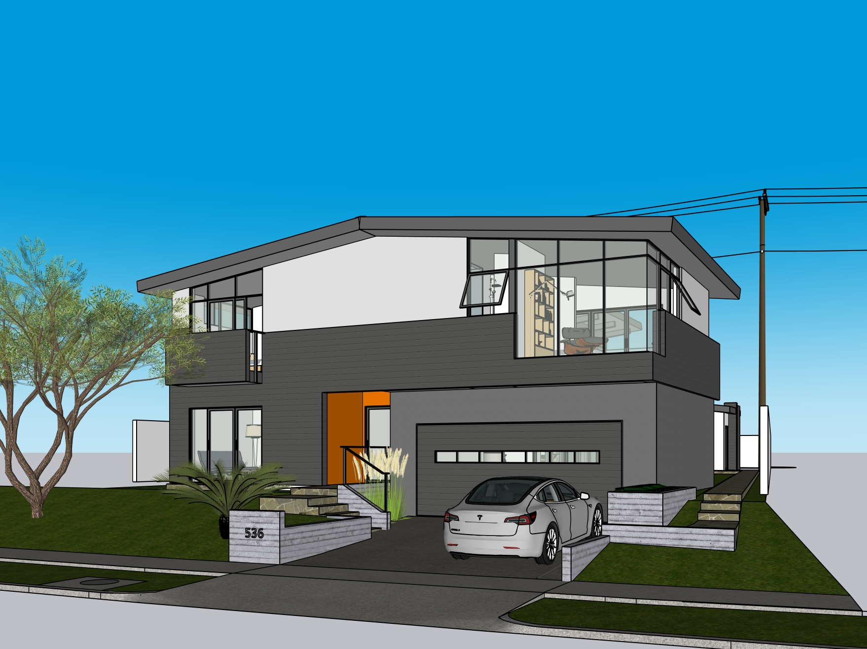 evening view lights on inside the house add california wild grasses and flowers to the landscape add grass in the the yard all of the spaces enhance the glazing materials add some lights in the planting areas use the perspective view from the source image add a woman walking a golden doodle on the sidewalk add a man and girl waling towards the front entry door don t change the camera angle of the source image add a woman sitting in the eames lounge chair in the bedroom above the garage keep the materials in the source image keep the window on the garage door add more california wild grasses to the frond yard on the left side of the view