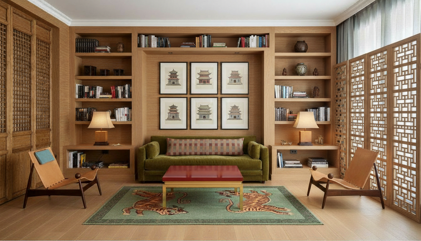 rimuovi completamente la parete destra e inserisci pannelli in legno con griglia geometrica fitta identici a quelli sulla sinistra wooden lattice panels struttura verticale a tutta altezza luce naturale che passa attraverso i pannelli elimina muro pieno mantieni invariato il resto della stanza