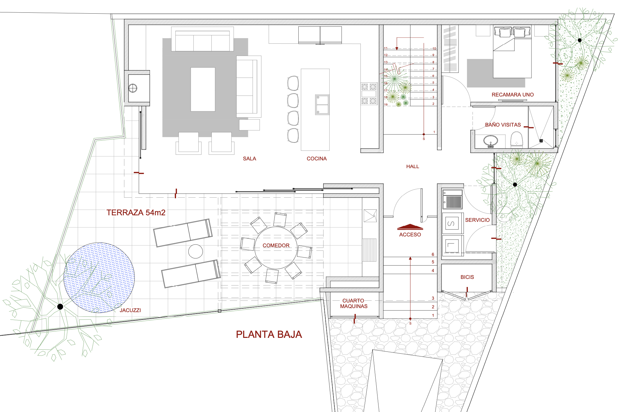 render an axonometric top view of modern house interior layout with a sophisticated and cozy atmosphere use warm beige and soft cream tones for the walls implement light oak wood for the flooring to give a natural touch incorporate modern furniture with sleek lines featuring a mix of matte white and dark gray use soft ambient lighting to enhance the mood add subtle greenery for a touch of freshness the open living space should feel airy and inviting with a seamless flow between areas maintaining a minimalist yet elegant aesthetic and a jacuzzi terrace with black limestone