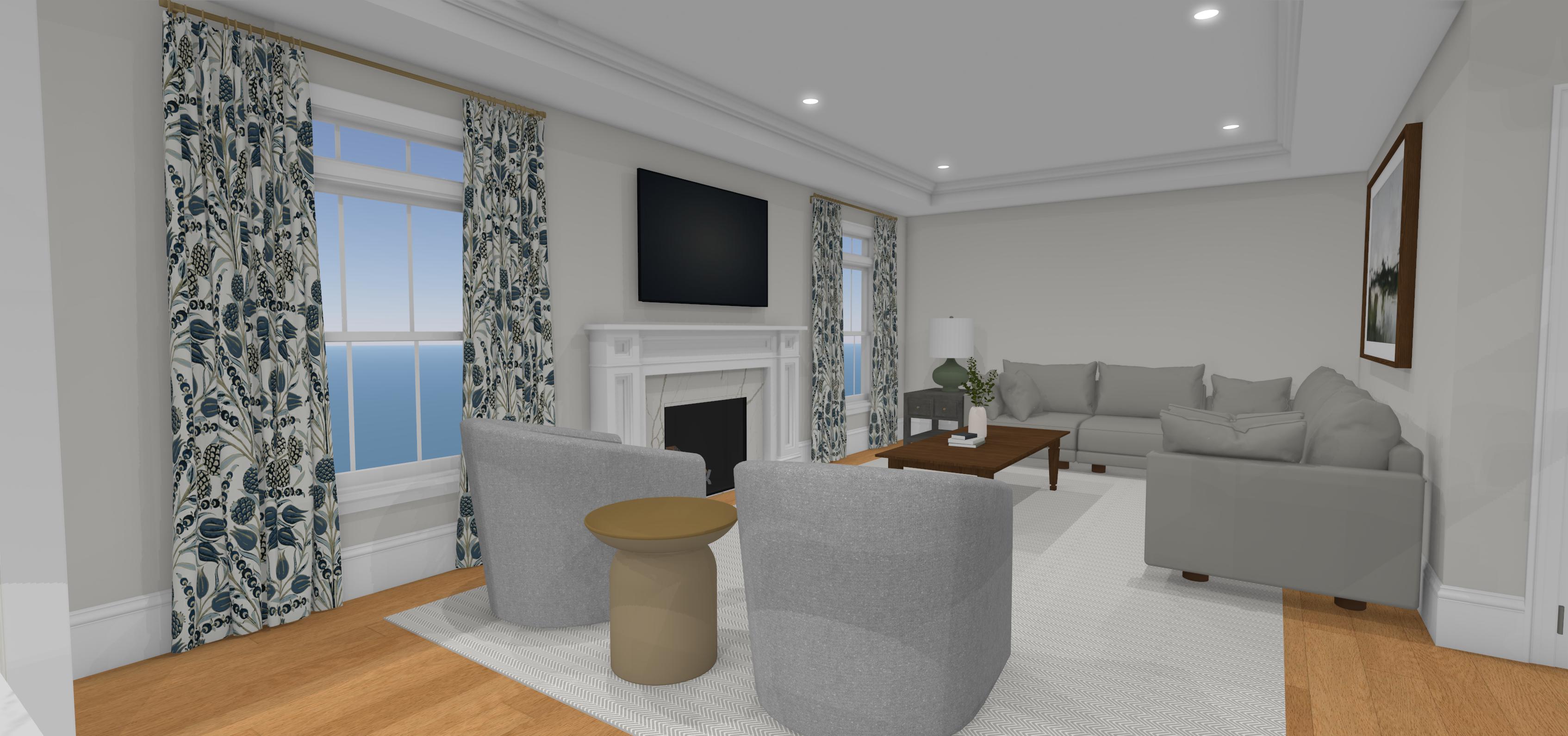 create a photo quality image of this space in the early evening use a soft neutral color benjamin moore edgecomb grey for the cabinetry except for the middle portion which would be soft cut white oak in a light finish use dramatic lighting to highlight the refined nature of this kitchen design