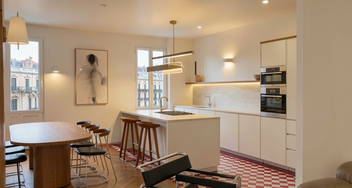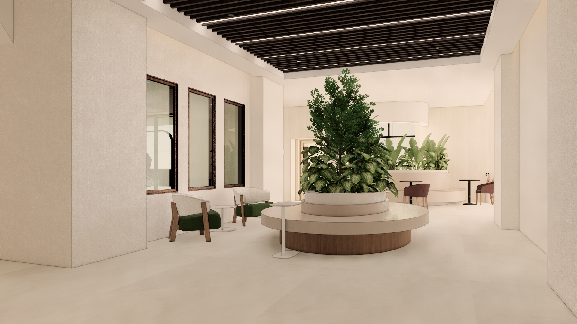 light matte marble floor and plaster walls add people seating at wood bench around planter keep all lighting and funiture as is
