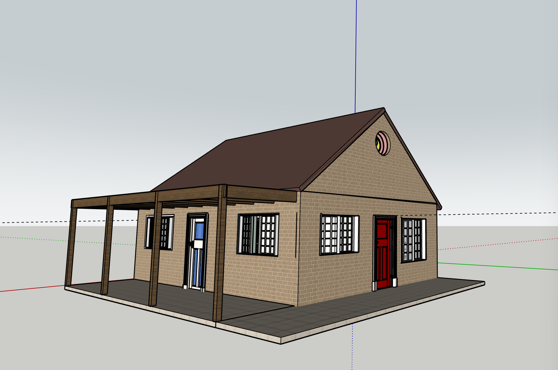 render highest quality photorealism and textures brick cabin set on sloping site in lush australian bushland