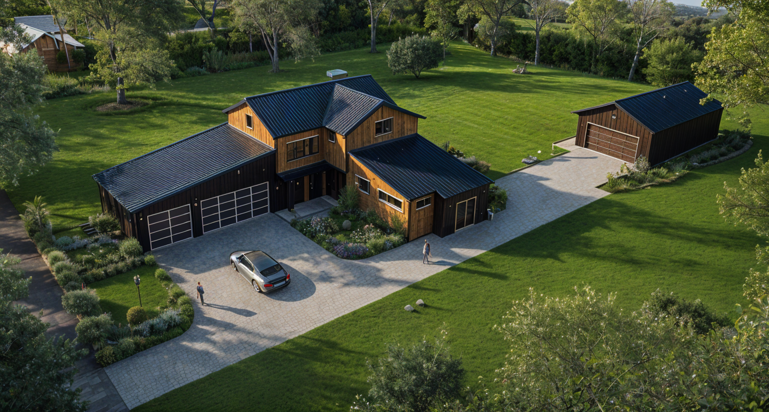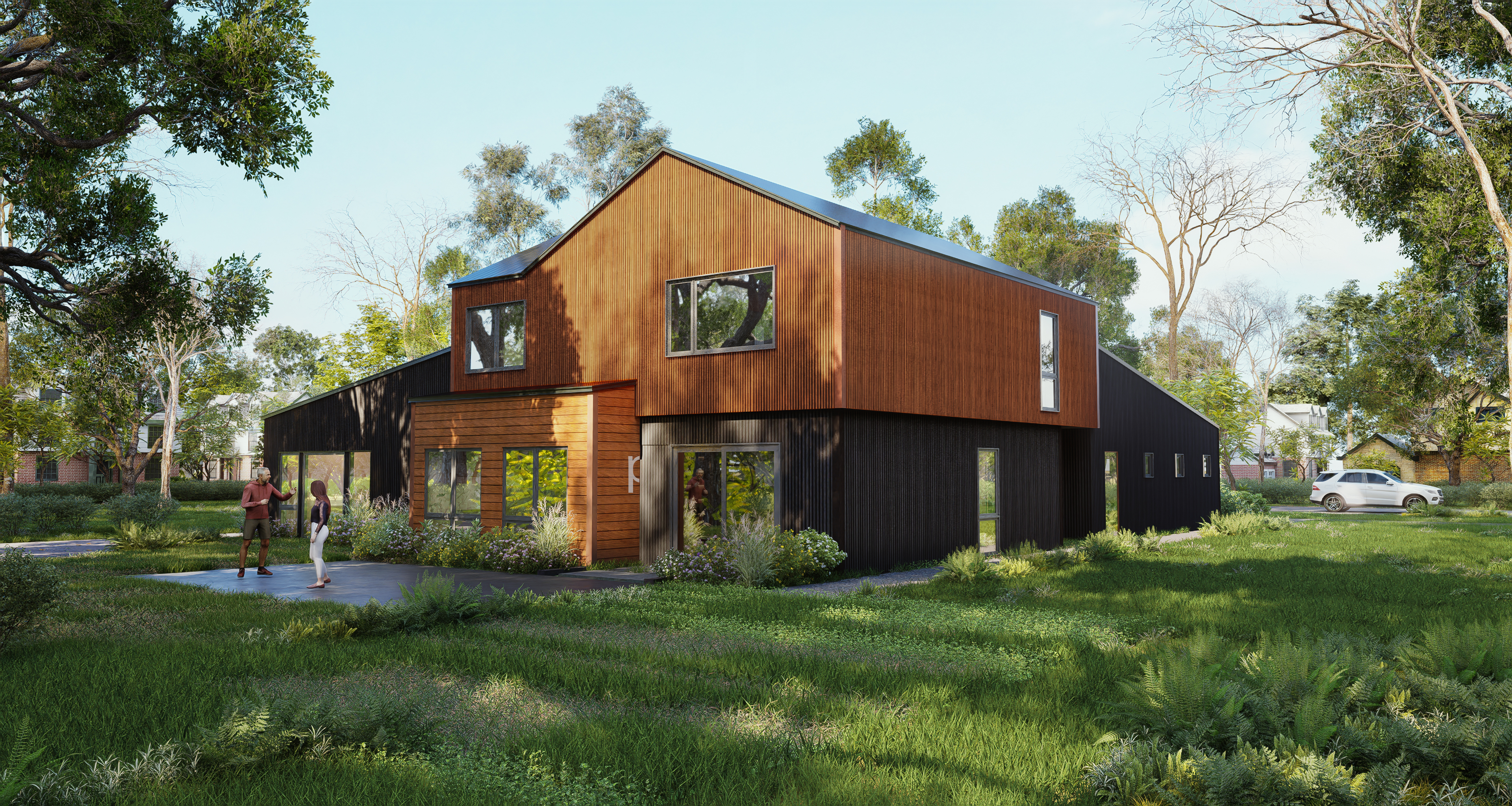 night time view of modern house with metal siding and wood accents large glass doors are garage doors not windows