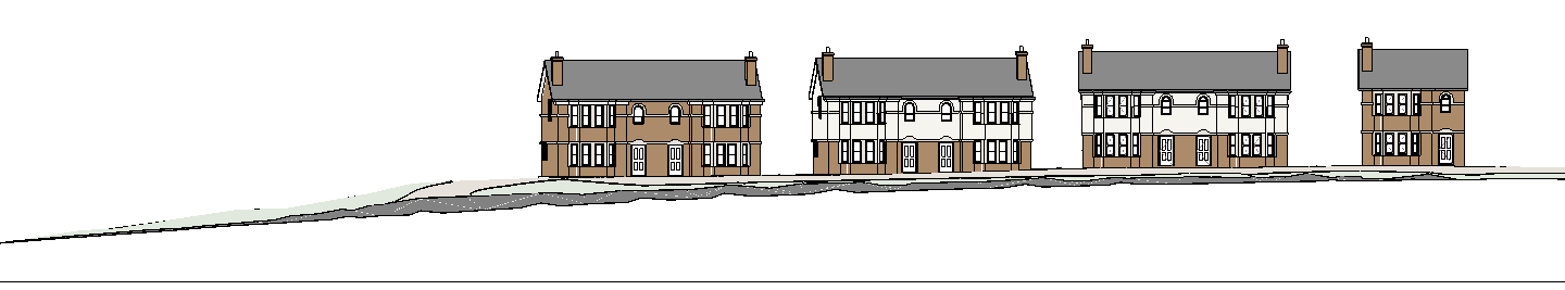create a realistic render showing this elevation of red brick georgian style houses the base should show the difference in topography via a sectional cut