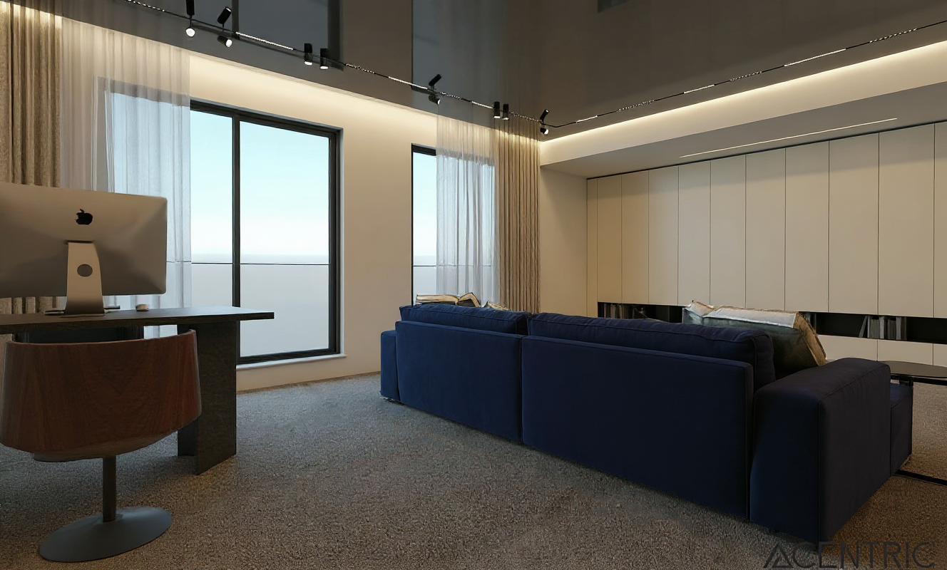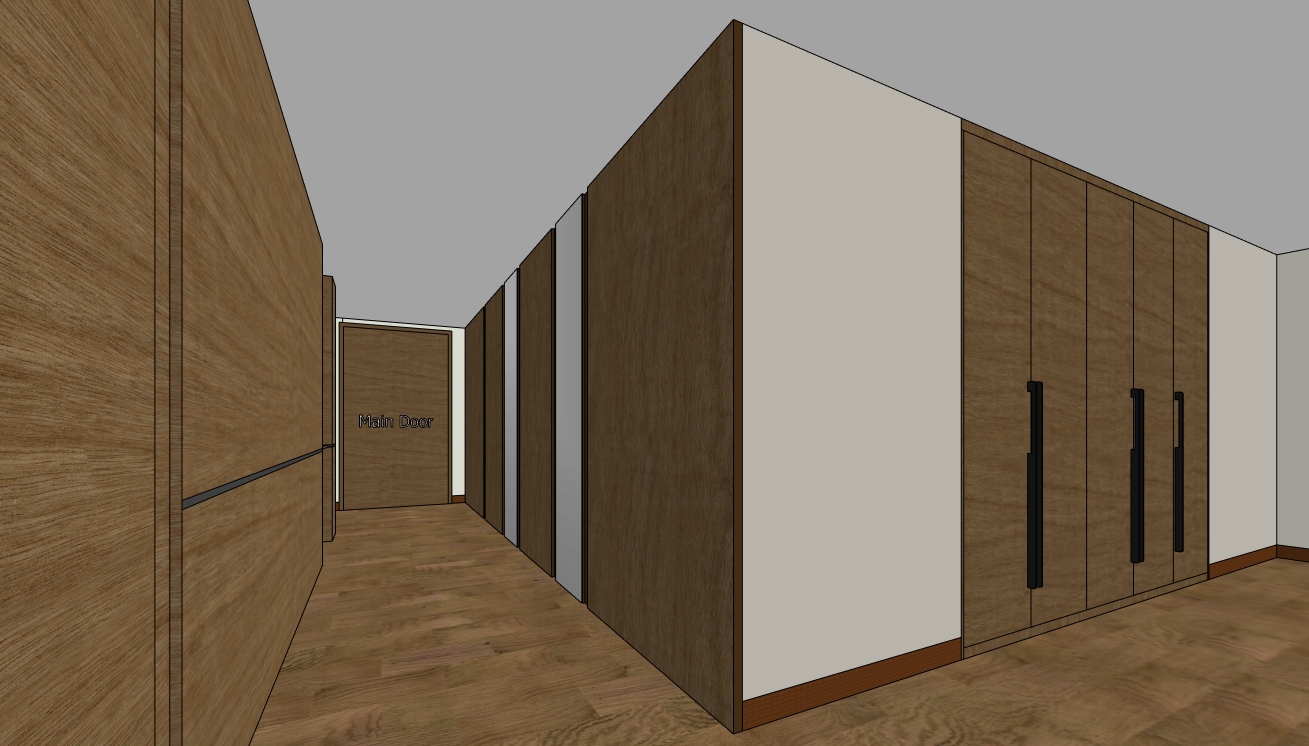 a modern interior living space featuring a minimalistic design a luxurious l shaped white sofa with soft cushions of pastel pink and deep navy elegant wooden shelves illuminated with warm ambient lighting casting a clean look the walls and floors are rendered in rich dark oak wood tones adding a touch of sophistication the atmosphere is serene and contemporary featuring a large window that lets in natural light enhancing the tranquil ambiance the hall way cladding are using wood and mirror alternayedly