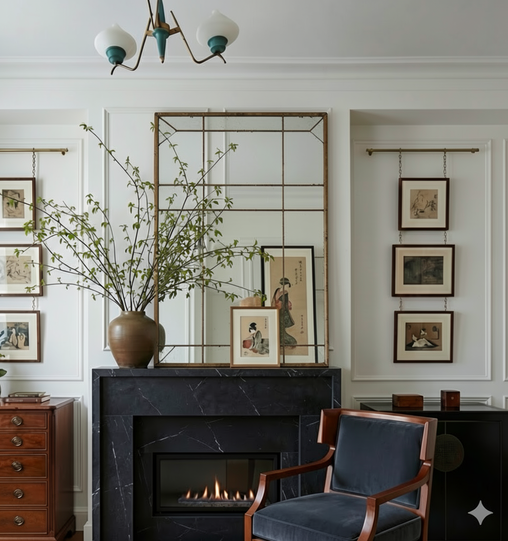 rener exactly as shown except make the antique mirror larger by about 12 higher and 12 wider keep the mirror straight lined as shown same geometry center the mirror over the mantle the mirror has antique glass there is a stack of beautiful coffee table books on top of the right side chest