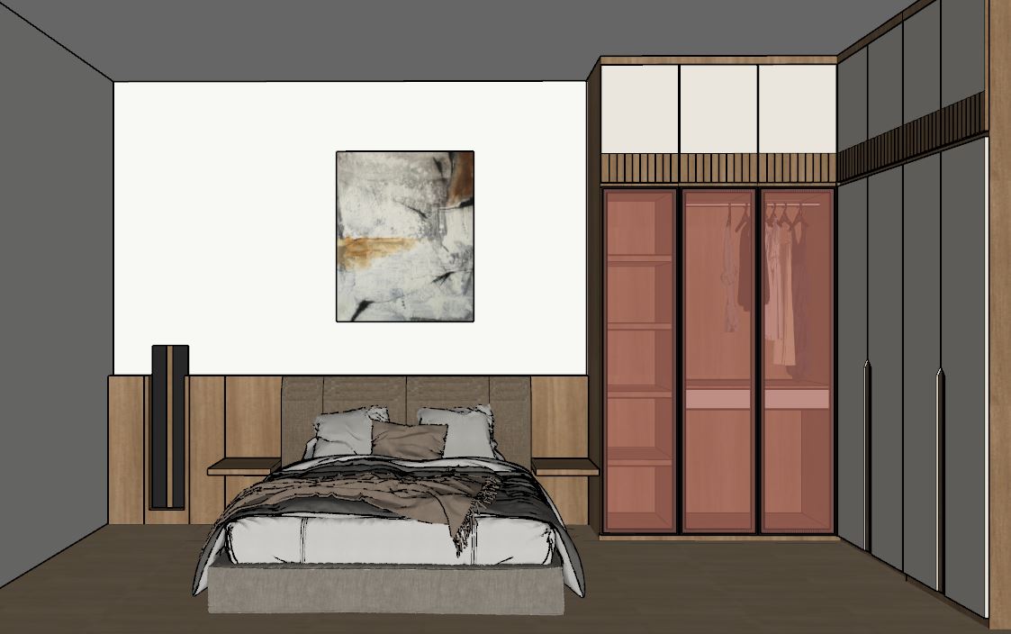 create ultra realistic images without changing any structure shape design or materials do not resize jpegs add ceiling spotlights and add indirect light to headboard panel and use brown glass with black stainless doff frame for wardrobe door and add some decorations the ceiling is white the wall is warm off white