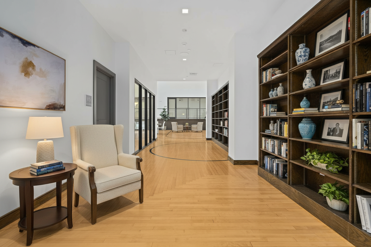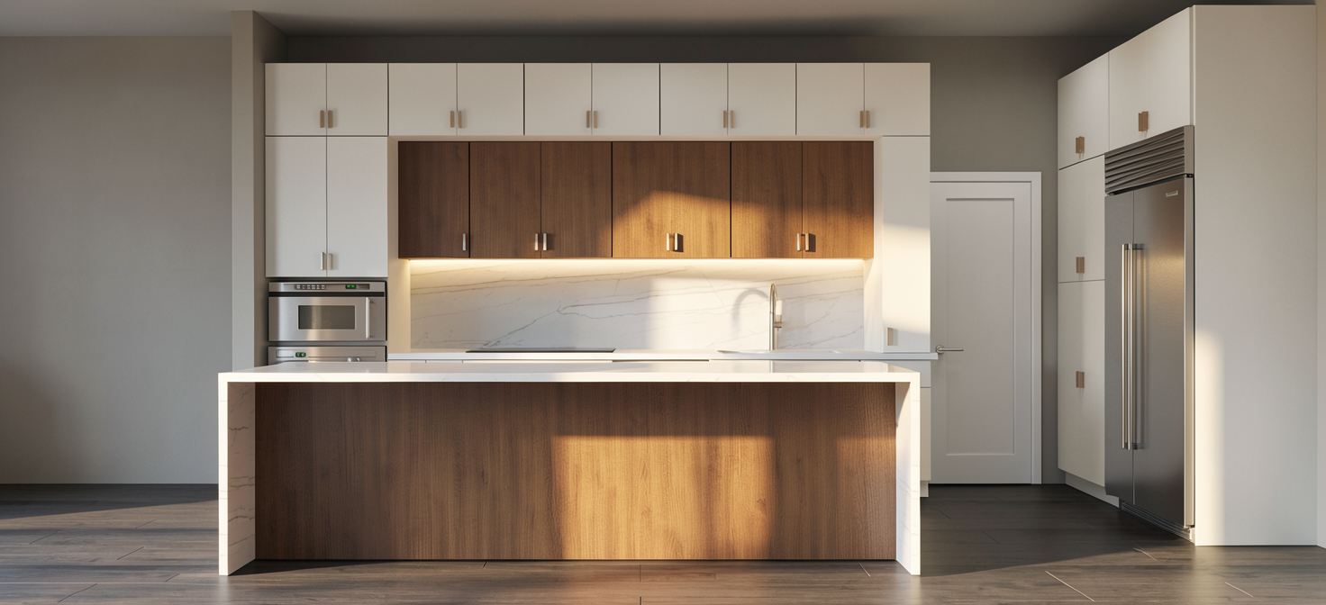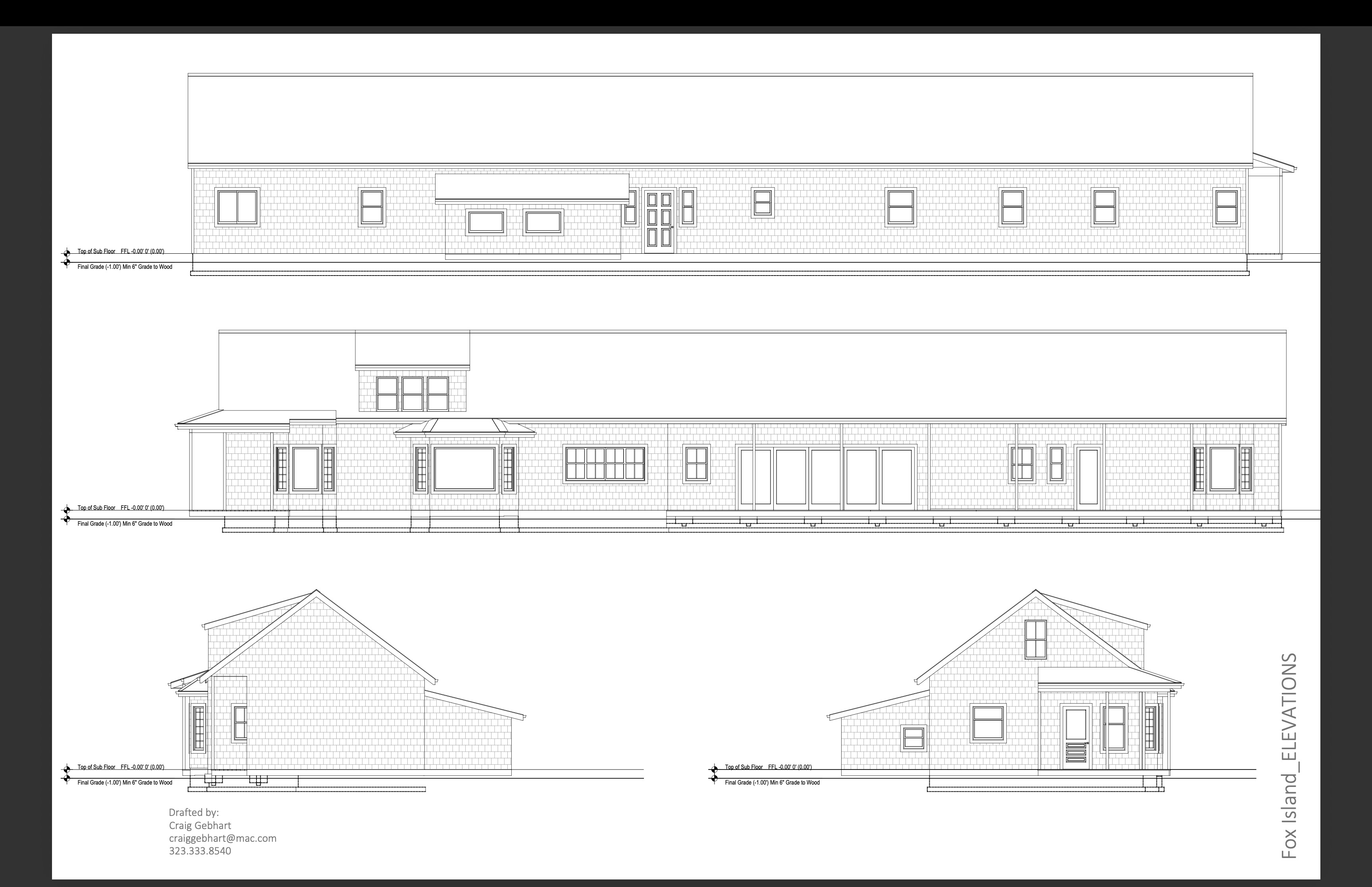 generate photo realistic exterior elevations the house is shingles painted white the doors door trim and window trim are robins egg blue the roof is dark grey it s a sunny day with white clouds the is a grass lawn and tall trees on both ends of the house add a flagpole with an american flag
