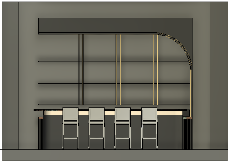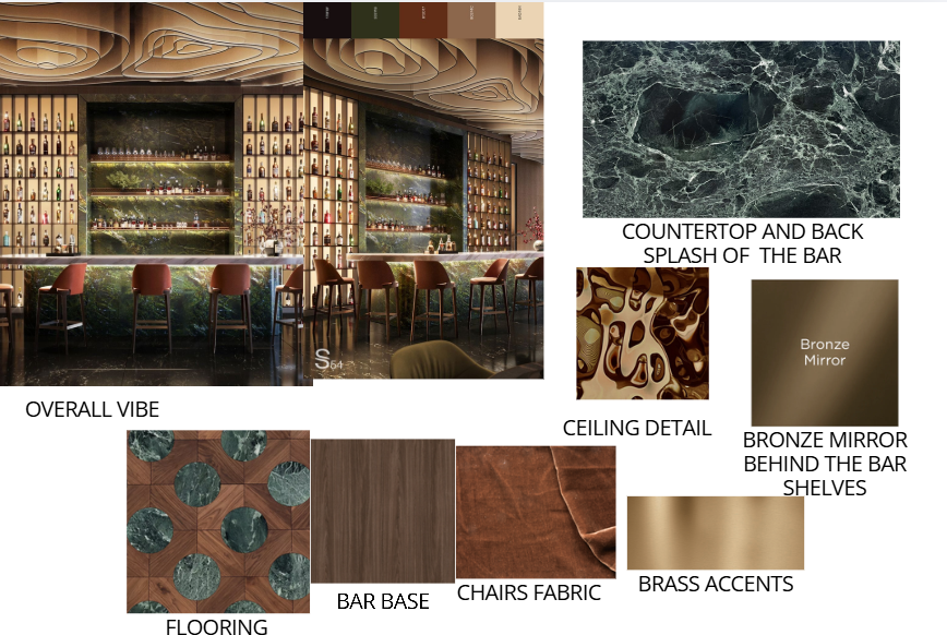 exterior shot create a high end photorealistic rendering of a luxury bar interior based on the provided elevation and mood board camera is straight on eye level centered on the bar overall mood warm moody upscale cocktail bar with rich materials and soft dramatic lighting bar counter backsplash use deep green marble with bold white veining rainforest green black forest look apply it continuously on the bar front countertop and backsplash polished finish with soft reflections back wall shelving full height open shelving system with a bronze mirror backing slightly tinted warm tone slim shelves with brass framing add bottles fully style shelves with liquor bottles glassware and bar accessories keep it curated and balanced metal accents all vertical supports and trims in brushed brass warm satin finish ceiling key feature hammered aluminum ceiling inspired by water rhythm texture fluid organic ripple like pattern finish in warm champagne bronze tone with soft reflective quality integrate hidden lighting to highlight the texture flooring geometric wood flooring with circular green marble inlays warm walnut tone bar base millwork rich walnut wood veneer matte finish visible grain seating important bar stools upholstered in orange crushed velvet vibrant but slightly deep tone burnt orange fabric should have visible pile variation with light catching the texture soft sheen directional nap frames in slim brass or dark bronze metal lighting warm lighting 2700k 3000k with led strips under shelves soft glow reflecting off ceiling highlights on marble and brass extra details subtle reflections in bronze mirror realistic shadows and depth clean symmetrical composition no people emphasize contrast between stone wood metal and velvet rendering style ultra realistic cinematic high detail luxury hospitality feel