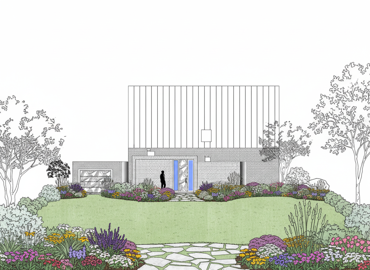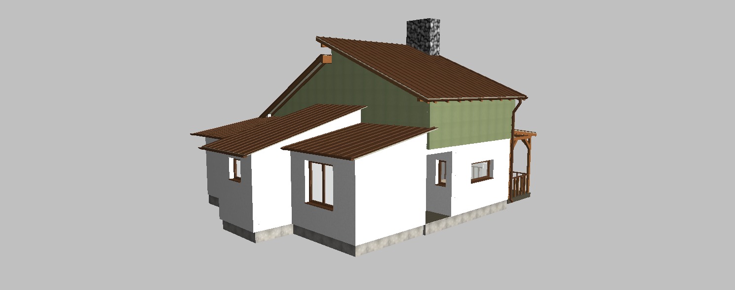 a high quality architectural exterior render of a small residential house with a traditional modern design the upper floor features vertical wooden facade cladding in olive green color with clean vertical alignment and visible wood texture the lower floor is finished with smooth white plaster the roof is made of chocolate brown trapezoidal metal sheets with matching chocolate brown metal gutters window sills are also in the same chocolate brown color pvc windows and doors are chocolate brown with a matte finish the terrace fence is made of brown wooden boards evenly spaced varnished with a protective coating the chimney is clad in natural river stone with irregular texture and realistic stone pattern the house is placed on flat terrain with subtle riverside vegetation typical for the banja luka area sparse grass low shrubs scattered deciduous trees and light gravel areas minimal greenery natural and restrained landscape soft natural daylight realistic shadows neutral sky no people photorealistic rendering high detail materials accurate proportions architectural visualization realistic textures clean and balanced composition
