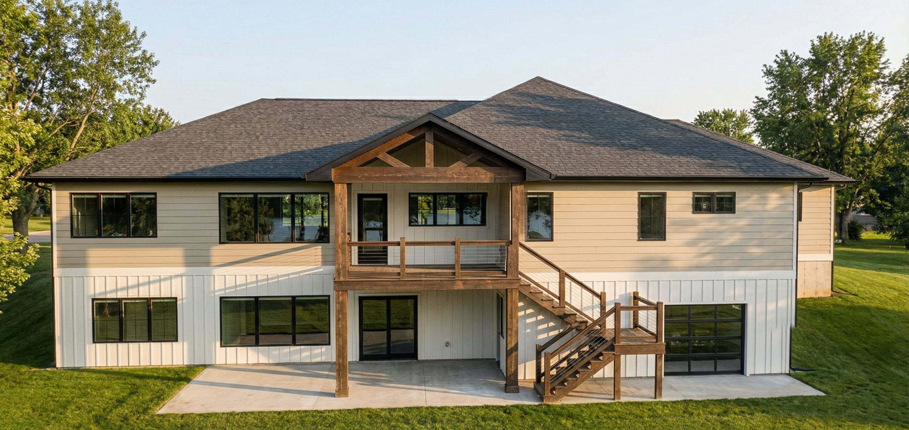 change siding color to dark cascade blue and keep garage doors and windows white and keep posts black