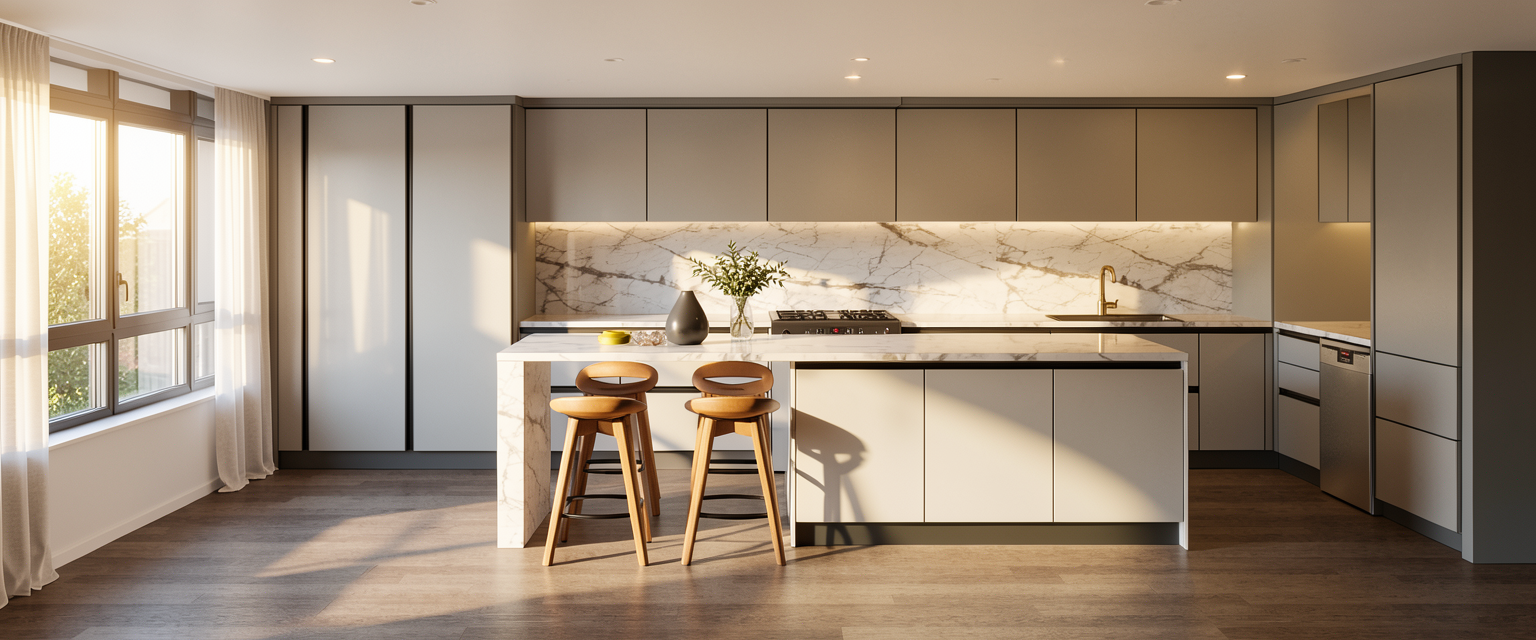 render senyata mungkin dengan panek warna krim polos dan dinding warna off white lantai vinyl krim dan panel di belakanag ubah jadi dinding polos tanpa pola pegangan tangga warna hitam ada lampu indirect di atas pegangan tangga dan di panel tangga yang bolong kasih pajangan dan lampu sorot kecil plafon putih