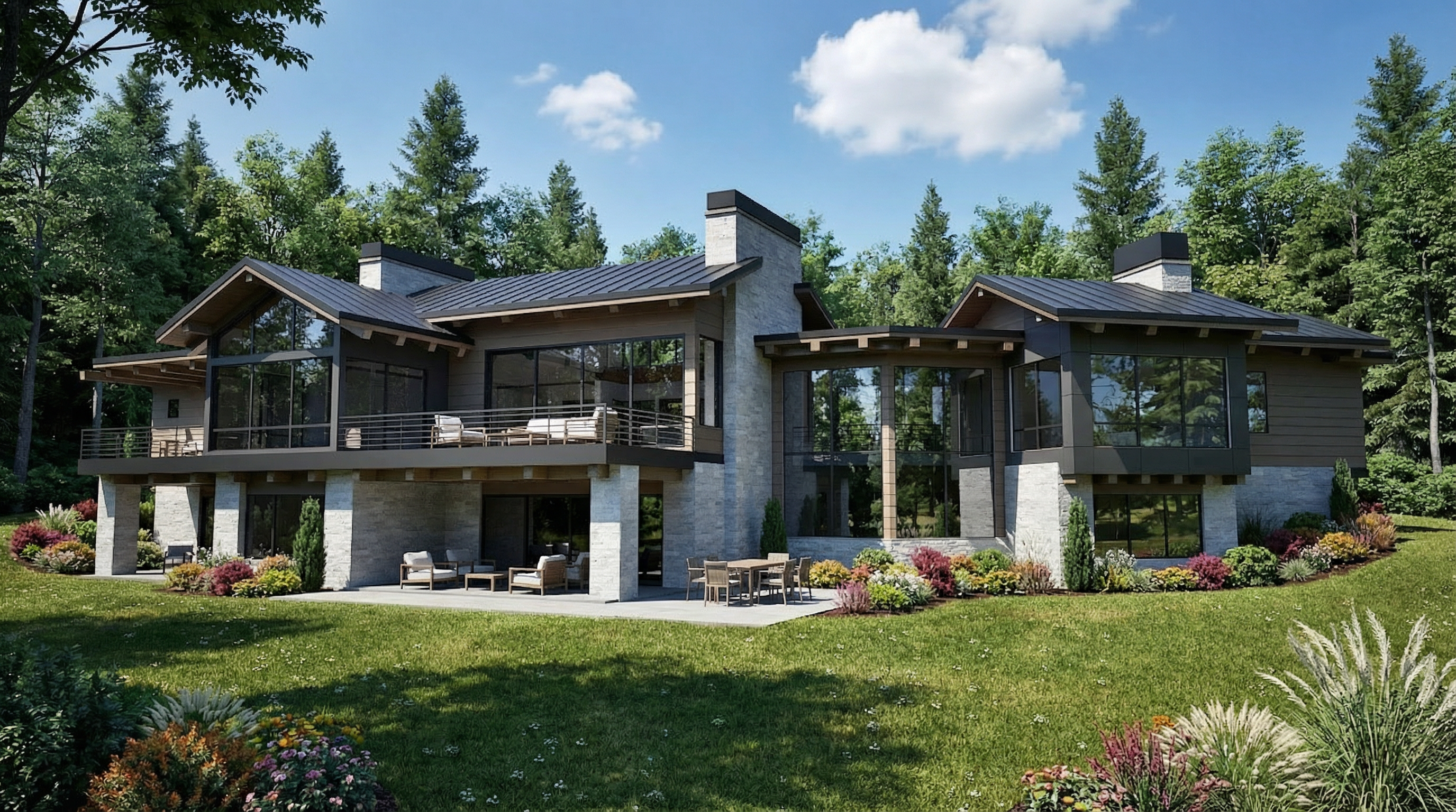 a mountain modern with greyish brown horizontal wood siding black standing seam metal roofing the stone is creamy white clean cut dry stacked stone the aluminum metal paneling is dark gray retain the exact structure window arrangement patio columns balcony chimney rooflines foundation height and proportions exactly as shown in the reference image surround the property with a lush dense forest of tall mixed evergreens and hardwoods make the environment a bright sunny day with a few fluffy clouds the light to be more direct onto the exterior of the house add plants and landscaping around the exterior to add some color add furniture on the balcony and the patio create ultra realistic lighting crisp shadows detailed textures in the wood siding metal roof and glass reflections