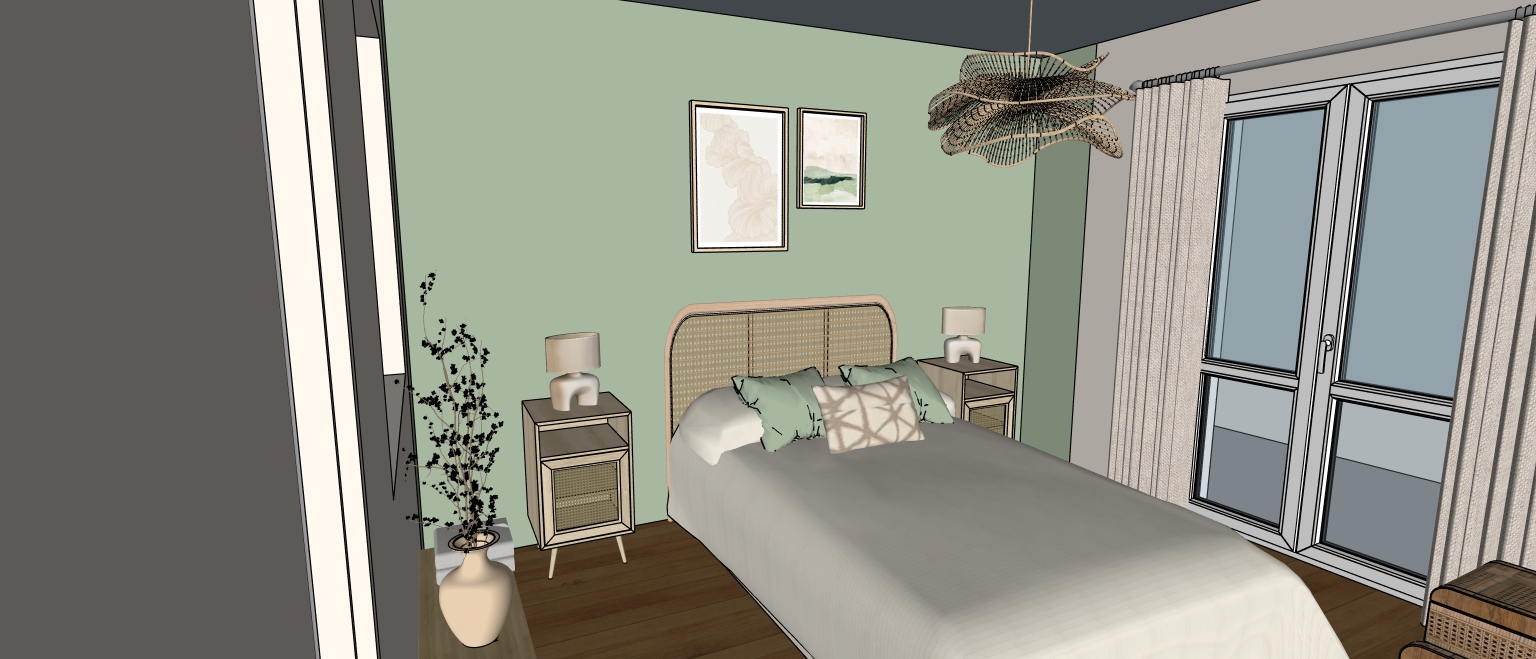 par la fen tre on aper oit un balcon avec rambarde blanche et un mur de s paration sur la gauche la vue est d gag e sur un autre immeuble et des pins