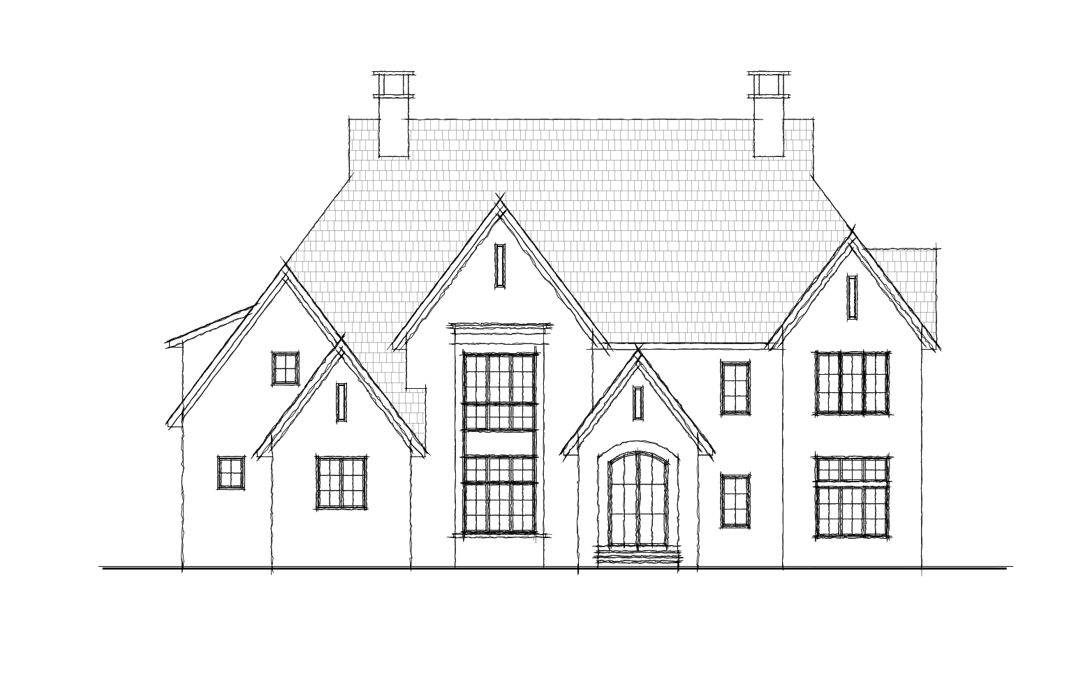 render a photorealistic front elevation of a custom luxury home the massing rooflines gable configurations chimney placement window positions and arched entry surround must follow image a the line drawing precisely do not simplify symmetrize or regularize the composition exterior materials lower level first floor light warm toned natural cut stone or ledger stone similar in color to image b creamy beige grey not pure white upper level second floor white or warm white vertical board and batten siding clean and flat the material transition line should occur at the second floor floor plate roof dimensional dark charcoal grey architectural shingles steep pitches gutters and trim painted white window frames and entry door matte black or very dark bronze consistent throughout entry retain the arched surround at the front door as shown in the sketch classical pilasters or columns flanking the entry painted white dark paneled double entry door with glass lites stepped stone entry stair windows dark framed multi lite divided light pattern consistent with image b s grid windows the large two story window bay left of center as shown in sketch should read as a dramatic focal element upper floor windows should align vertically with lower floor windows landscaping simple refined low clipped hedges ornamental shrubs green lawn no trees blocking the fa ade natural stone or bluestone front walk atmosphere bright natural daylight slight three quarter lighting from the left slight blue sky with soft clouds photographic quality eye level perspective from the street no fisheye distortion suburban lot no neighboring homes visible do not add a front porch portico roof or any element not present in the line drawing do not alter the roofline or redistribute the gable massing do not make the garage wing symmetrical with the right side the asymmetry is intentional