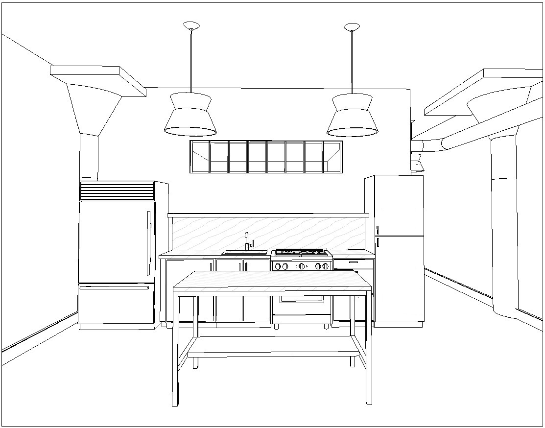 photorealistic rendering of a modern warm residential loft kitchen polished concrete floors white walls and white concrete ceilings are painted smooth creamy white floating shelf on backsplash wall is light oak kitchen cabinets are a light sesame elm wood white marble with soft grey veining on countertops on back kitchen counter show counter backsplash on wall up to floating shelf counter backsplash is white marble with soft grey veining base of island counter in foreground painted dark graphite gray white marble countertop on island mauve colored metal pendants with black cord and housing light fixtures illuminated with downward light from the bottom of the fixture and upward light from top of light fixture use a combination of soft interior lighting and exterior golden hour daylight do not change any building geometry do not change or add any architectural elements do not change windows or doors keep camera view and angle the same do not add any decor not shown in reference image window above kitchen has painted white metal frame and mullions