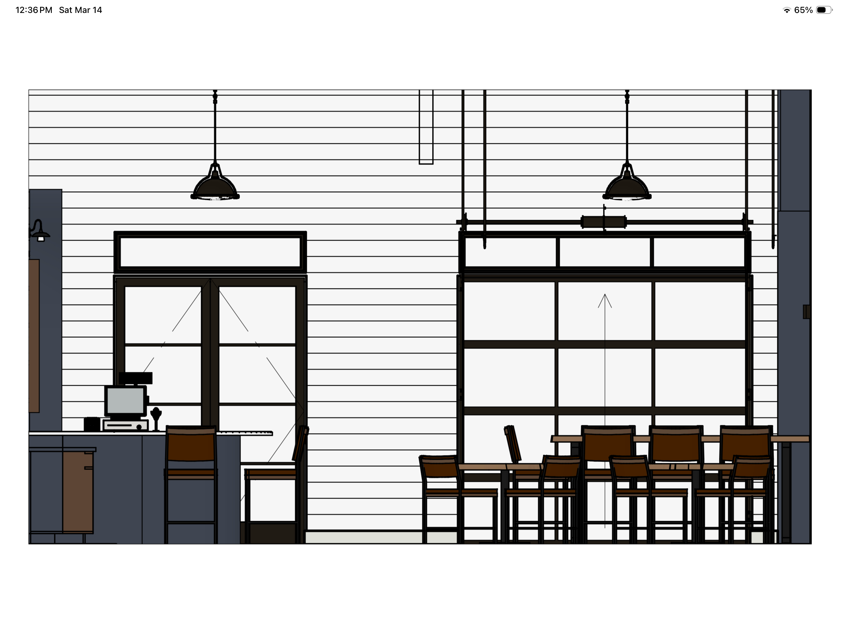 make this into a 2d cad drawing in black and white remove the chairs and furniture from in front of garage and the lighting