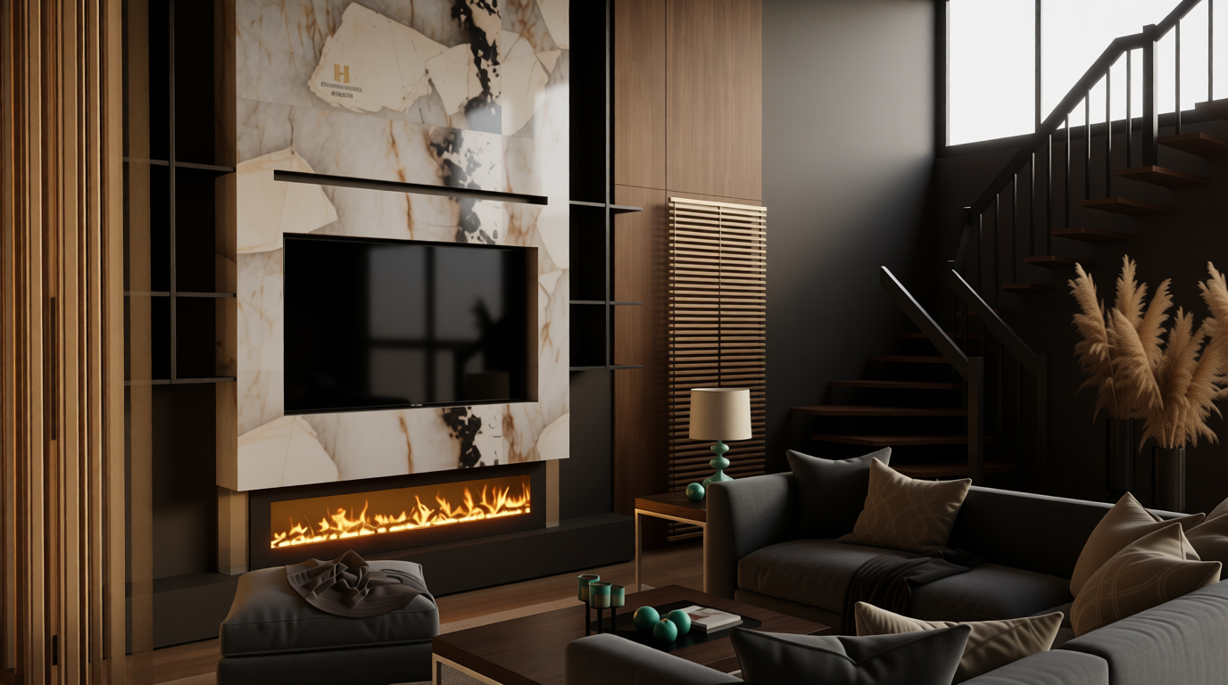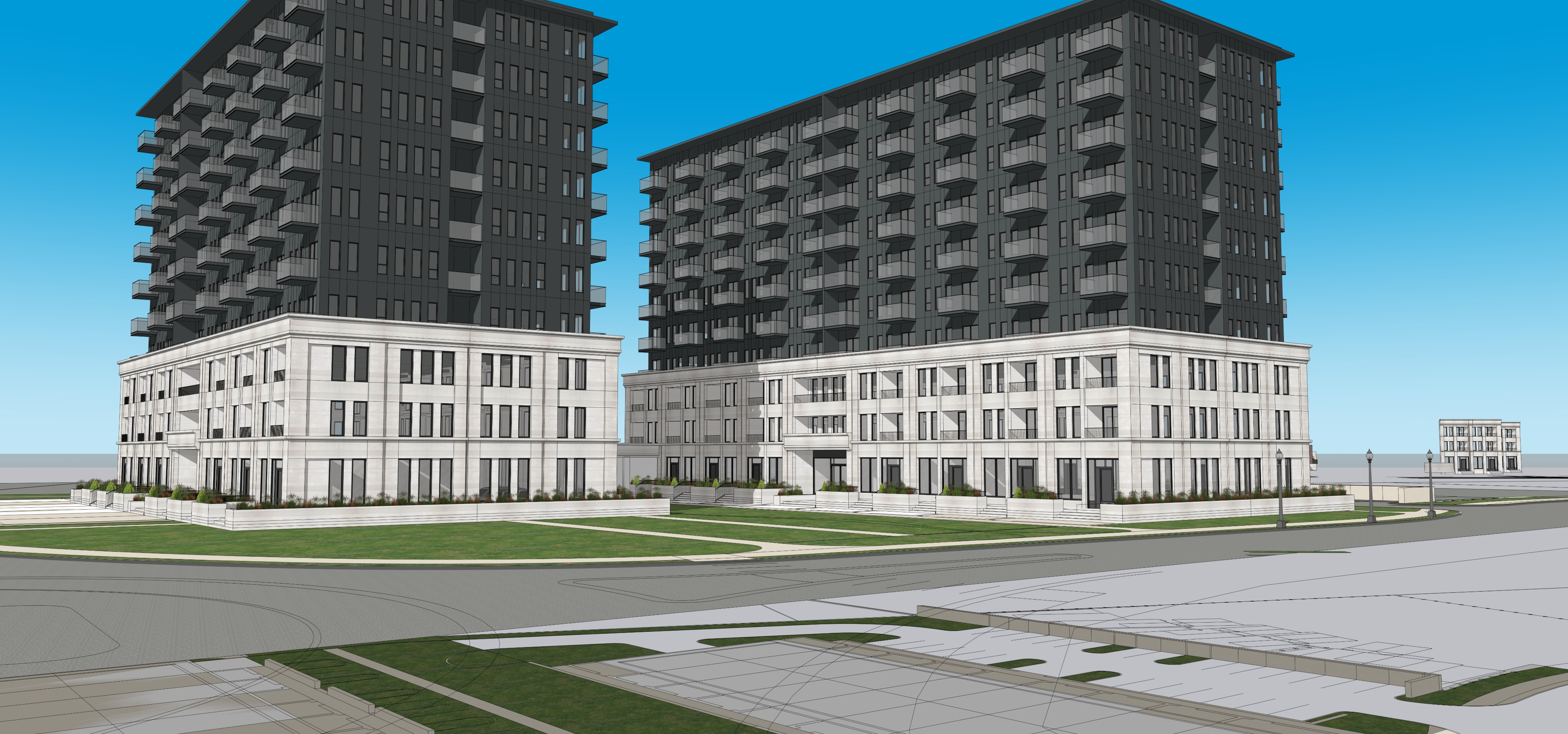 photorealistic rendering of two buildings with stone bases and metal panel and glass upper portions townhome terraces with plantings at ground level early fall deciduous trees add people and cars