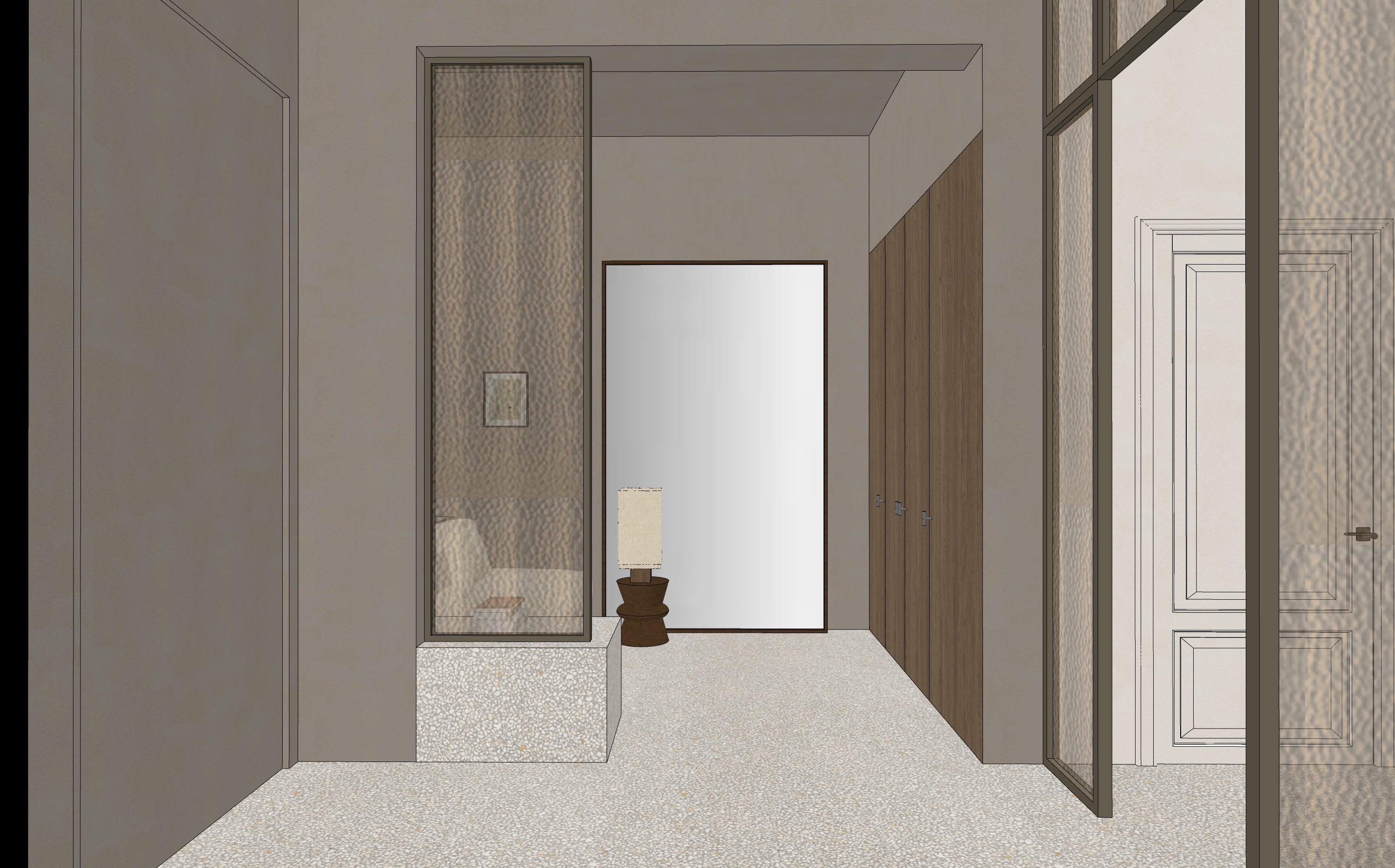 a modern hall in a classic high ceiling herenhuis with terrazzo floors and a brown grey matt wall and ceiling colour for a luxury cozy vibe in the back is a big stand alone mirror with dark brown oak frame the windows are in byzantine glass