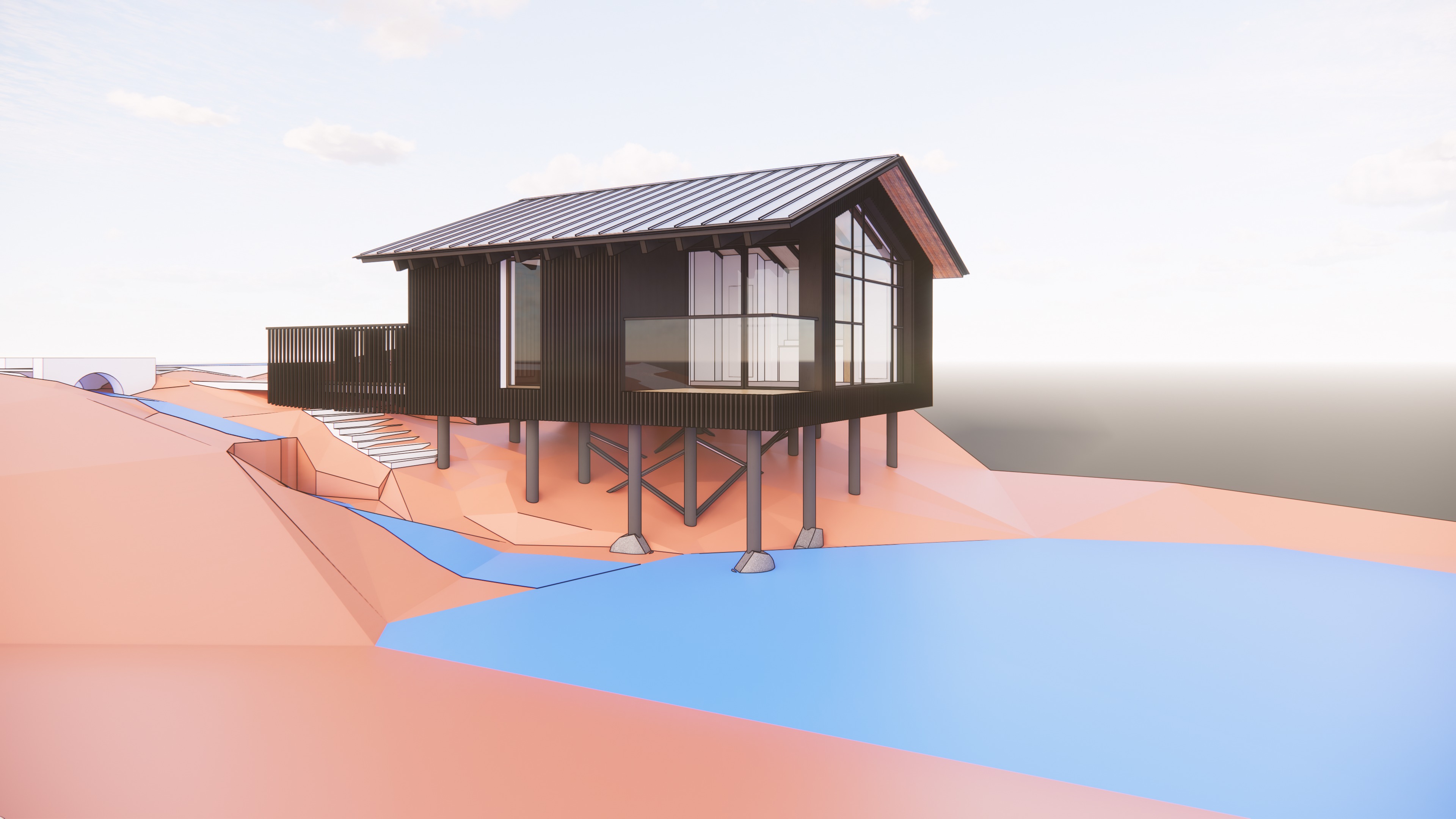 maintain the light to see the details under the roof wal material black burned wood posts forest landscape pond roof is pigmento brown