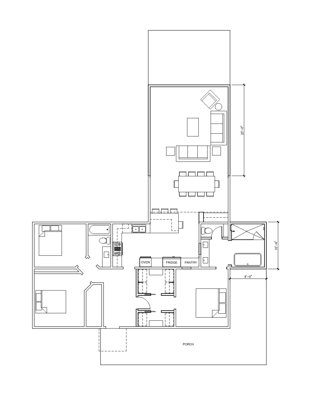 convert this floor plan into a realistic isometric 3d view of a full house show the space from an elevated angle with furniture walls and details visible wood flooring except black hexagonal tile in kitchen and bathroom add in a scandinavian glass front wood stove in the living area use the same furniture as shows on the plan do not change the orientation of the floorplan