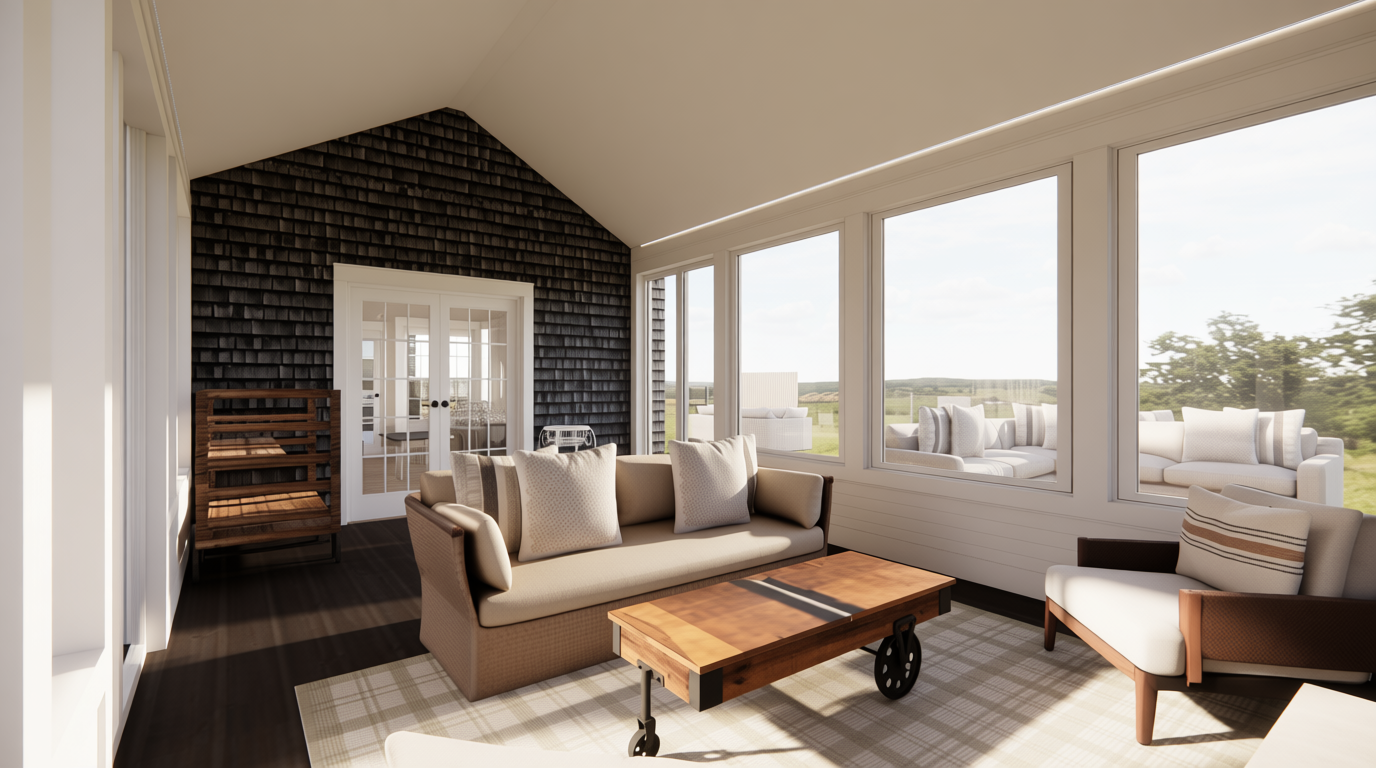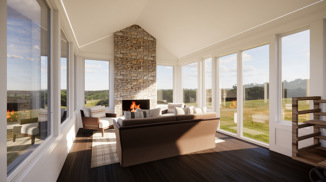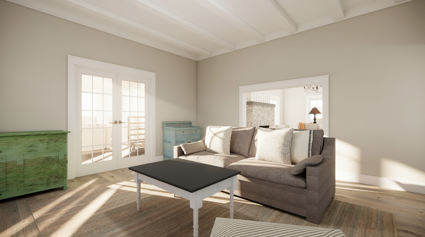 make the lights on the tree light up include daylight entering the space include indirect and direct ceiling light but do not show the ceiling lights include a rustic rug under the lounge sofa two chairs and coffee table do not include any additional items remove the flooring shown outside the door and show and outdoor courtyard scenery that is pretty do not change the colors or shape of any items shown keep the shape and color of all furniture shown add a simple tree skirt under the tree
