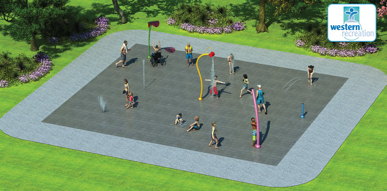 create a realistic rendering of the splash pad design surrounded by trees children no adults and a variety or ethnicities people of colour