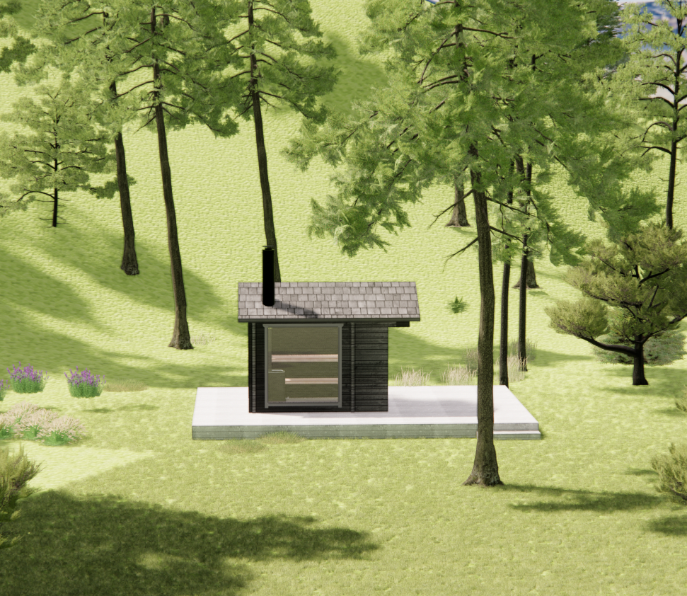 render a photorealistic 3d perspective of this house the current material style keep model geometry keep material colours the same windows doors roof walls make a green meadow with moss gray several pine trees around looks native to swedsih forest do not change relief do not change the view only enhance the current materials and make the landscape nicer vegetation detailed textures in the wood siding and a vibrant clear sky with light atmospheric depth render in hyper realistic architectural visualization quality 8k resolution
