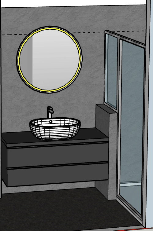 a modern minimalist bathroom design darker oak flooring complements a light wood grained vanity and a cabinet with matte black handles a glass shower enclosure with elegant brass fittings completes the design the atmosphere is calm and relaxing accented by lush green plants hanging in black pots the lighting is soft and natural creating a relaxing spa like atmosphere the mirror is front led light the shower alcove with four shelves is illuminated from top to bottom by an led strip the fixtures are brushed copper the mirror reflects the smooth frameless white door
