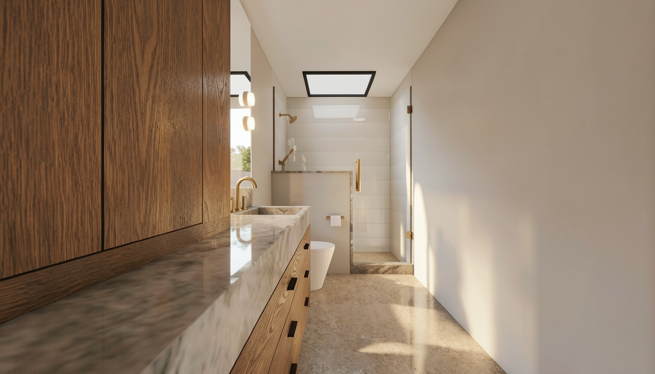 make the flooring in black tile make the toilet and vanity in black make the walls in white penny type tile matte black shower handle and head change the shower pan to be floor level