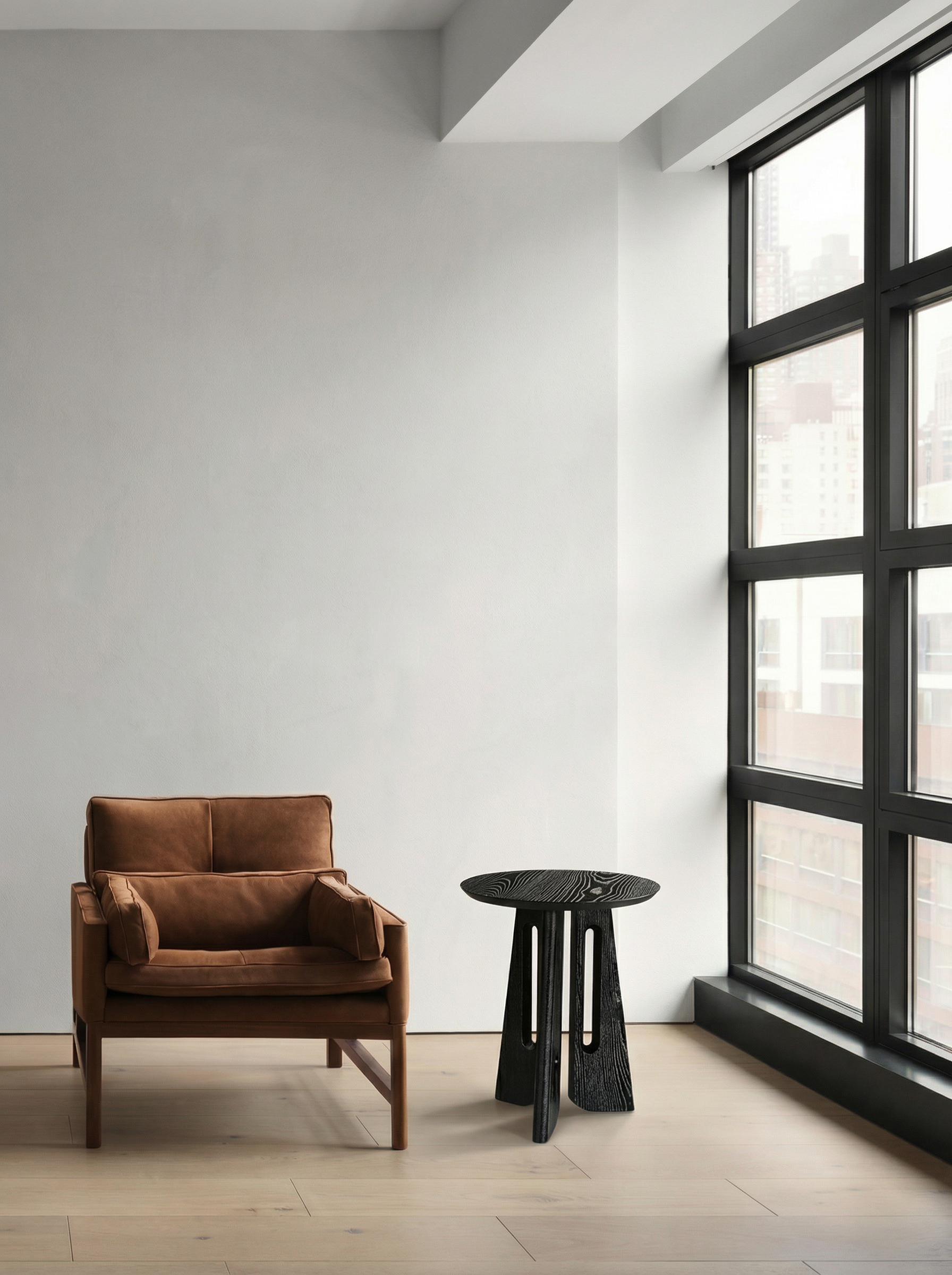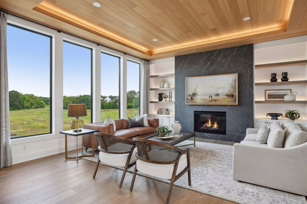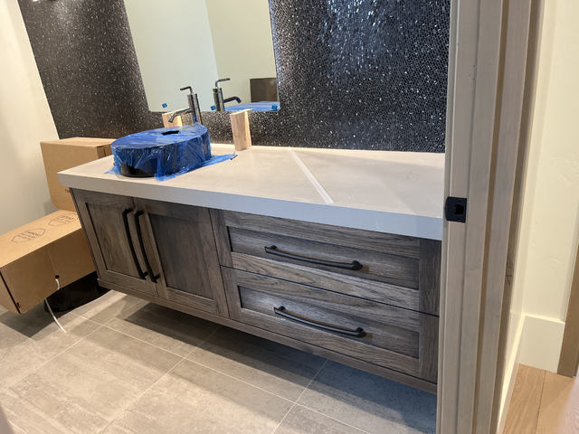 do not change the cabinets in any way preserve the exact cabinet colors materials finishes dimensions door and drawer styles hardware spacing alignment and all geometry exactly as shown do not alter the countertop shape backsplash appliances flooring lighting fixtures or wall structure only remove the construction materials clutter and mess from the scene clean the room and make it look finished and staged add a few simple tasteful home accessories appropriate for the style of the space but do not add or remove any furniture windows or architectural elements maintain the original lighting direction and realism enhance clarity and polish the photo while keeping the cabinetry and room design completely unchanged do not alter the lighting to keep the cabinet colors as they are in the image remove the cardboard from the black toilet remove the blue film on the black sink stage the countertop for a modern industrial bathroom and include a bath rug in front of the vanity