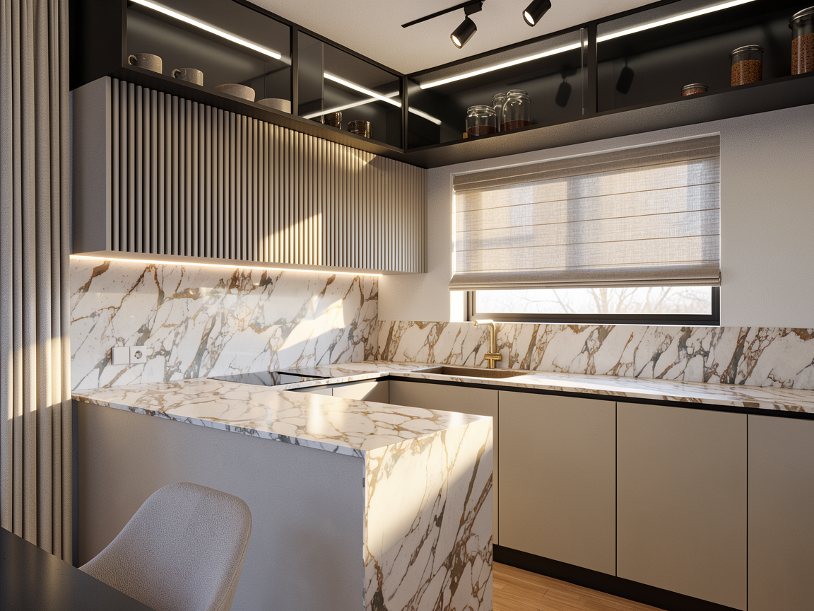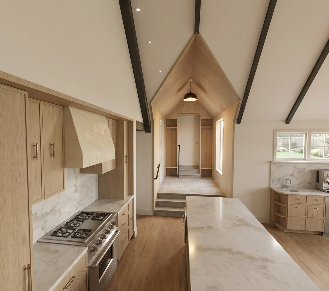 add flush pull handles on the cabinets and make the render realistic and make it bright