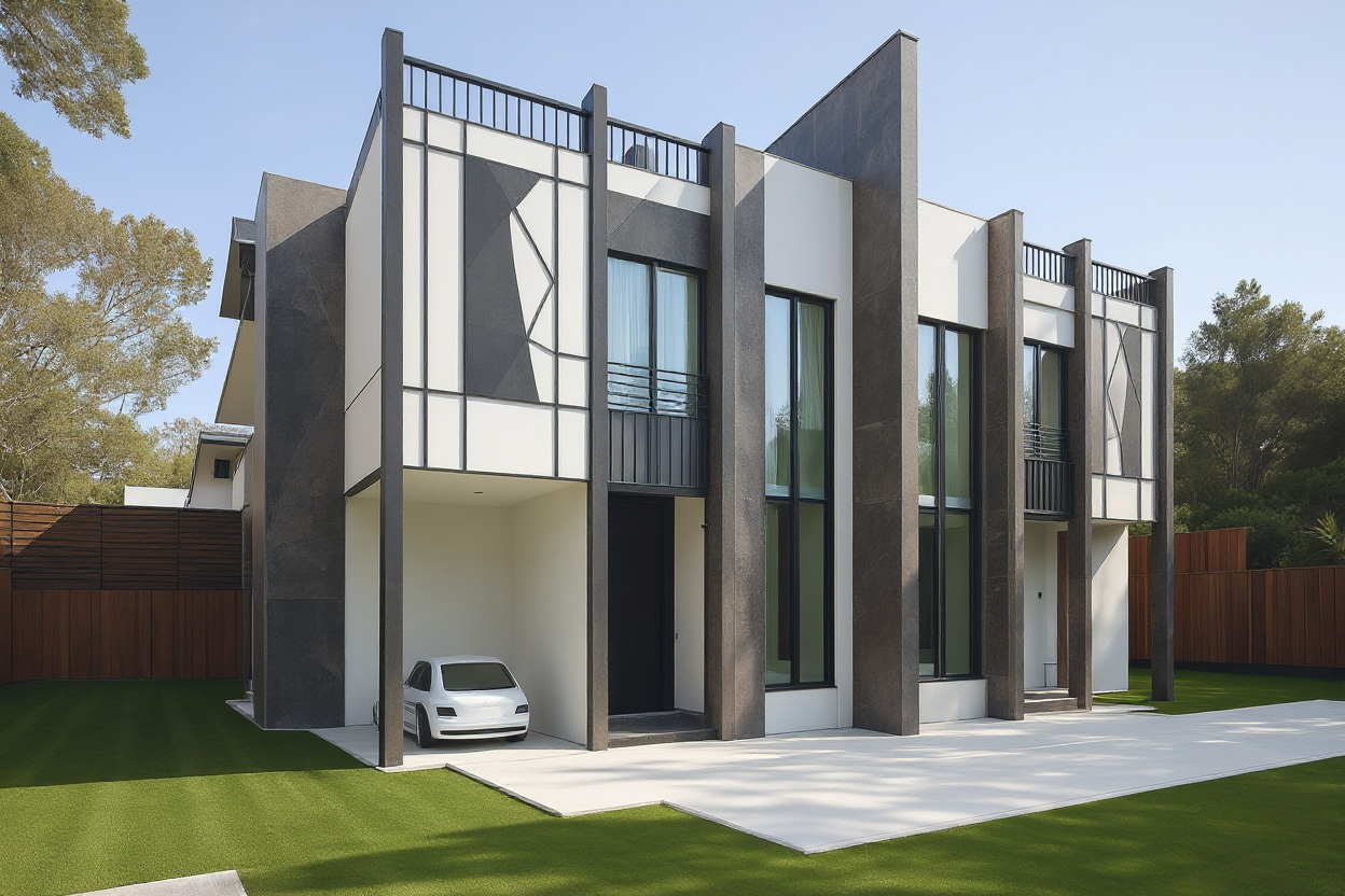 modernist exterior shot simple contemporary modern villa like the ones in la with 2 contrasting material colors and walkable entrance architecture