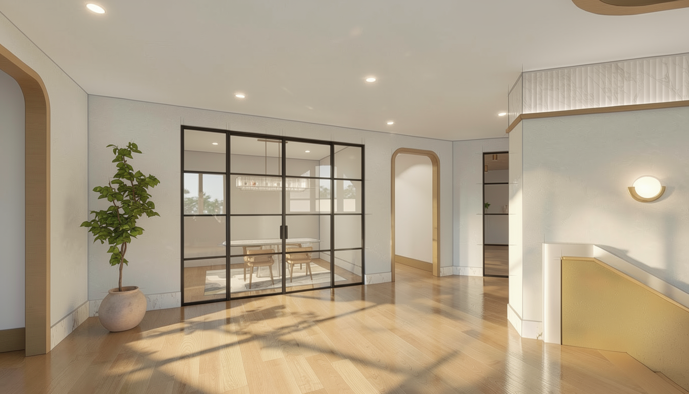 render this bathroom with light oak vanity and brass handles no window in this room only overhead lighting wall paint should be white