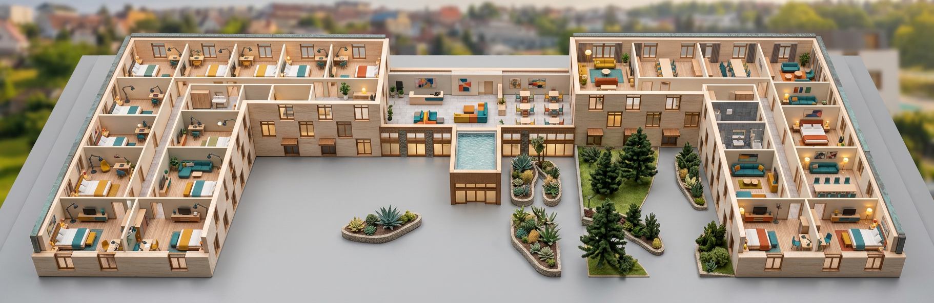 convert this floor plan into a realistic isometric 3d view of a full house show the space from an elevated angle with furniture walls and details visible balsa wooden maquette light up interiors plants to dry trenches alzheimer home rooms use the same furniture as shows on the plan do not change the orientation of the floorplan