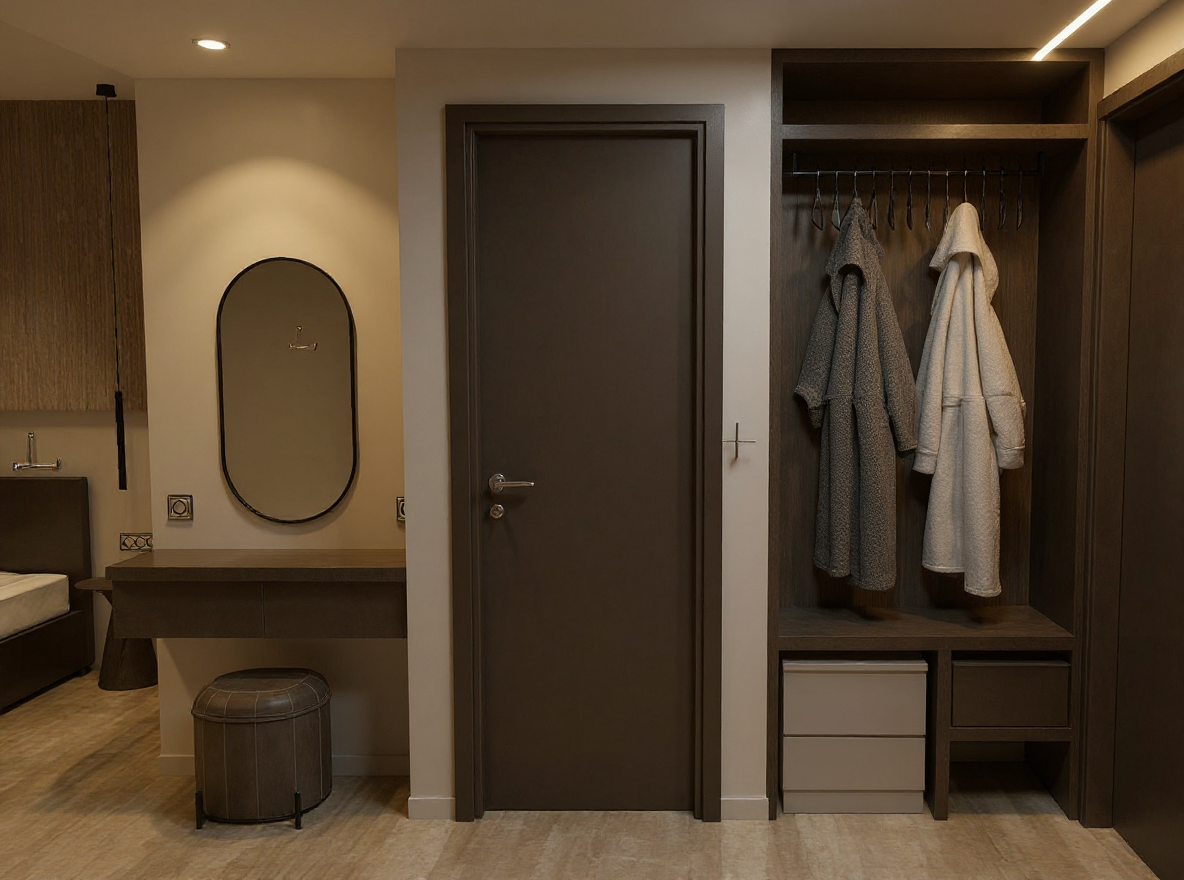 high quality led linera light above hanger led mirror light floor travertine matte render two bathrobes
