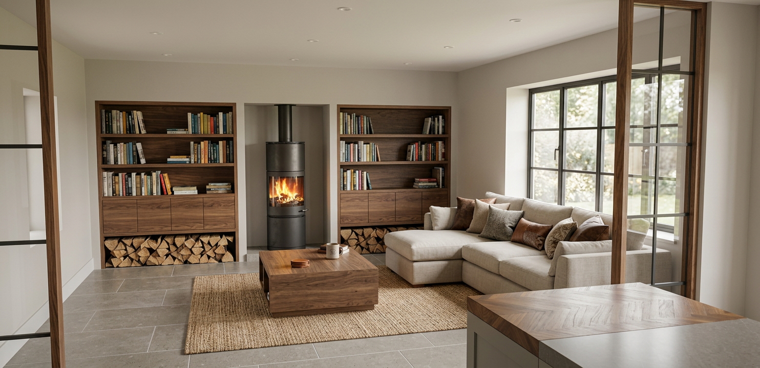 add books to left and right shelves add two light coloured l shaped sofas to match indicated size with cushions add a natural fabric rug underneath coffee table