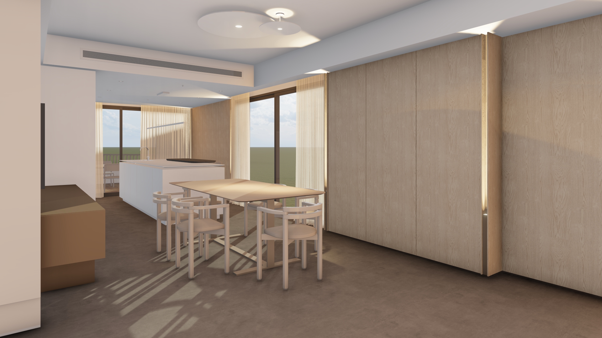 render this image in a realistic style maintaining the exact same composition furnishings lightning and design without adding or removing elements the floor is gray ceramic like polished concrete and the wood is light brown almost desaturated