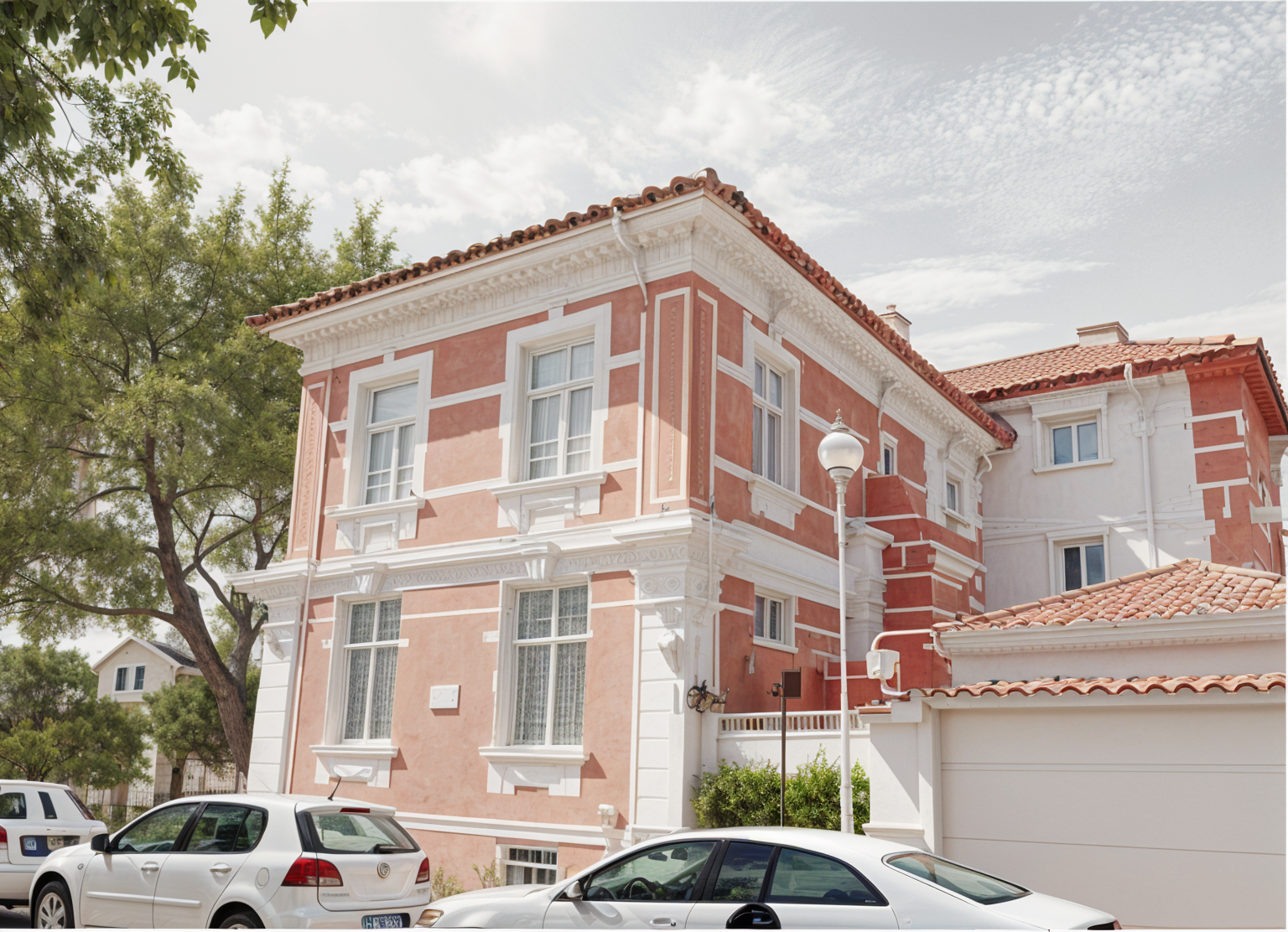 exterior shot restore the existing house while fully preserving its architectural structure and decorative details all decorative elements and window trims should remain intact and be painted in white replace the current red facade color with a softer red or terracotta shade to achieve a warmer and more refined appearance the final result should reflect a careful renovation that highlights the historical charm of the building add an additional floor on top with a modern look architecture