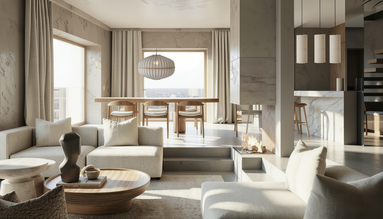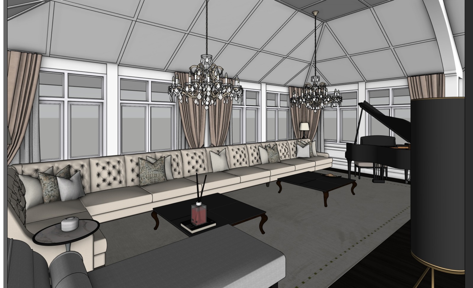 aman quiet luxury interior afternoon sun maintain the exact architectural geometry room proportions openings ceiling height wall positions and spatial layout exactly as modeled in the sketchup file do not redesign or modify the architecture only adjust materials lighting furniture styling and decor to achieve the atmosphere of a refined luxury lounge inspired by aman resorts interiors combined with classical european elegance scene setting soft afternoon daylight interior scene natural warm daylight enters through windows creating soft shadows and gentle highlights across surfaces lighting balance warm afternoon sunlight diffused daylight filling the room crystal chandeliers glowing softly but secondary to daylight subtle warm reflections on wood and metal the room should feel peaceful calm and sunlit atmosphere create a feeling of quiet luxury timeless elegance serene hospitality architectural calm inspired by aman resort lounges and refined european private residences the space should feel expensive but understated avoid overly decorative styling colour palette refined neutral palette warm ivory plaster walls sand cream upholstery dark walnut wood bronze or brushed brass metal accents crystal glass chandeliers accent colour burnt orange velvet armchairs palette must feel warm earthy balanced and sophisticated furniture styling furniture language transitional luxury with aman restraint use cream upholstered sofa burnt orange velvet lounge chairs dark walnut coffee tables slim marble side tables elegant dark wood console with brass base furniture arrangement should feel balanced and symmetrical feature architectural element central backdrop with arched bronze lattice panels material direction dark bronze metal refined geometric pattern subtle metallic reflection layered depth behind the screen materials use high end natural materials walnut timber flooring woven natural rug brushed brass metal crystal chandelier glass velvet upholstery bronze lattice screens materials should feel rich but restrained lighting quality lighting should be photographically realistic requirements physically accurate daylight simulation soft interior bounce light gentle shadow gradients subtle chandelier reflections in crystal warm afternoon ambience avoid hdr exaggeration overly bright highlights artificial glow camera architectural photography composition lens 35mm camera eye level centered symmetrical perspective aligned with chandelier axis and central console keep vertical lines perfectly straight render style ultra photorealistic architectural visualization render should resemble luxury interior photography for aman residences or high end boutique hospitality interiors captured in warm afternoon light