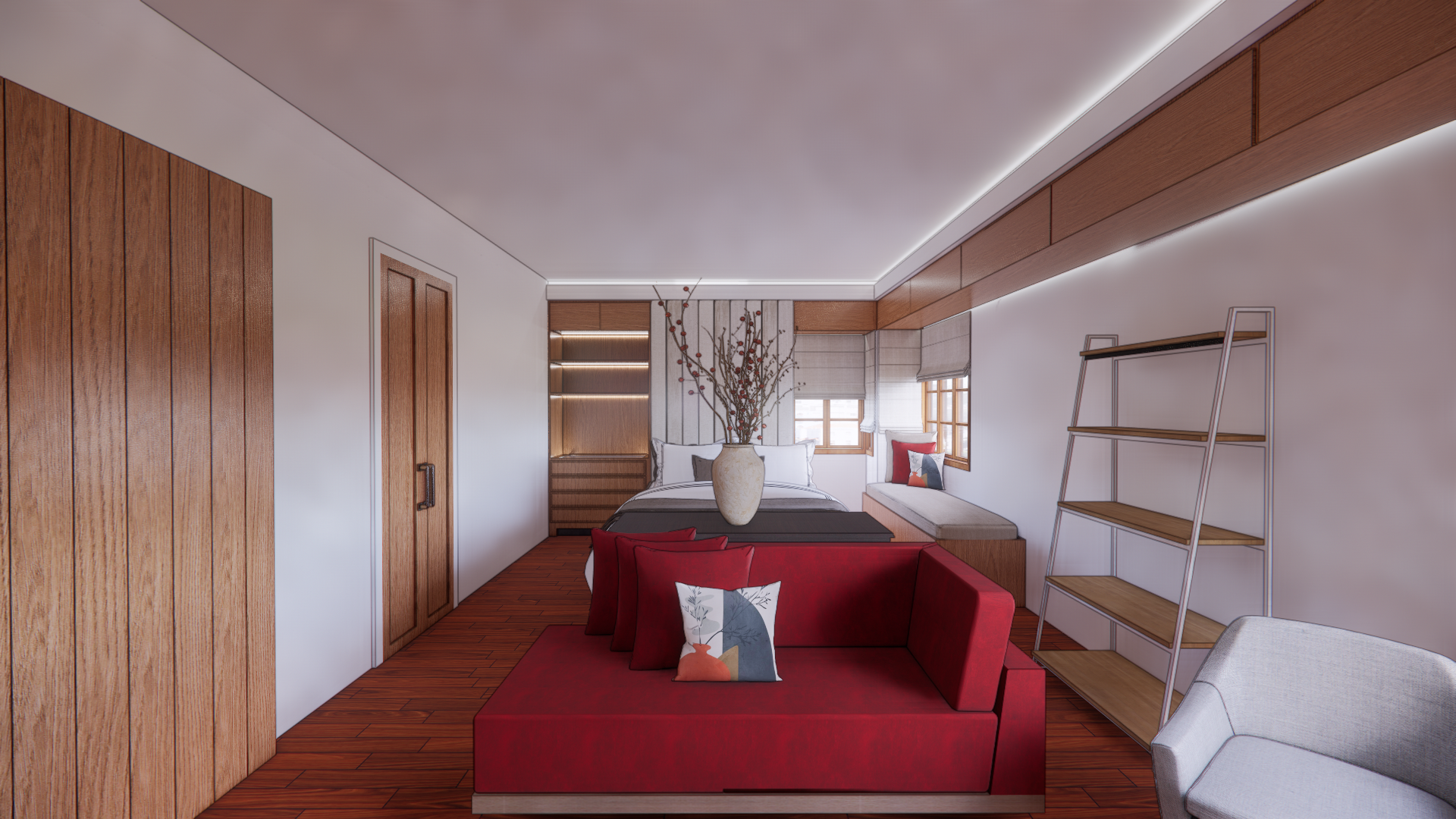 interior shot enhance the original living room render without changing any existing elements composition or furniture only adjust materials lighting and color tones to match the warm contemporary mood board apply soft natural morning light with gentle highlights and realistic shadows refine materials to have matte beige walls walnut toned wood surfaces and linen or wool textured fabrics keep the palette warm and neutral cream sand taupe and caramel hues enhance overall contrast softly for depth while maintaining natural color balance ensure all surfaces show tactile realism and a cozy elegant ambience consistent with the mood board keep reflections subtle lighting cinematic yet natural and atmosphere serene architecture