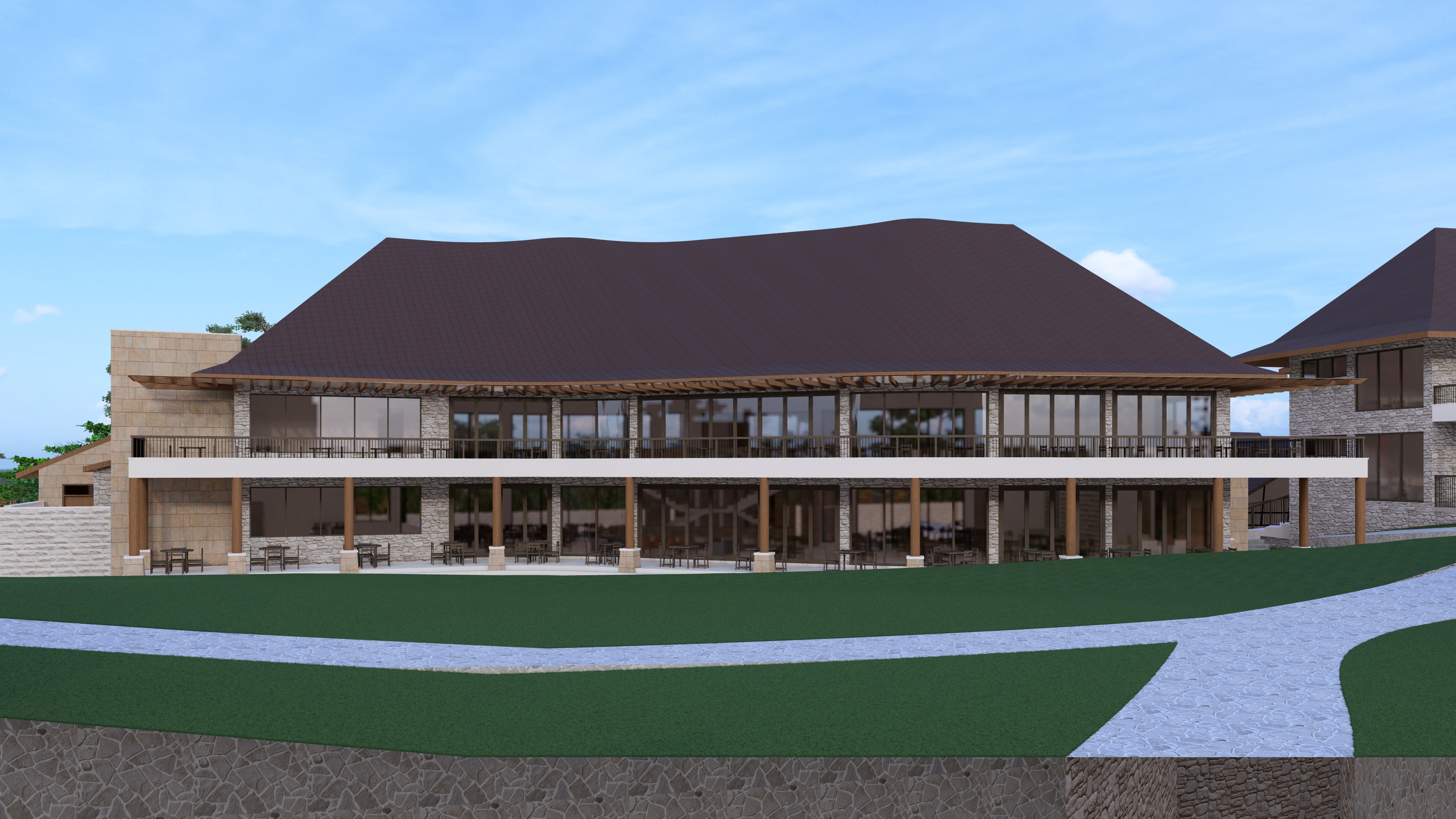 this is a resort restaurant enhance the scene by making it look a bit lived in make grass look more realistic add vry few trees to the compound retain roof texture and some potted plants few around where the furniture is but not on the columns maintain all materials as they are just enhance colour shades do not adjust or cropp the main building p s we have no wooden walls