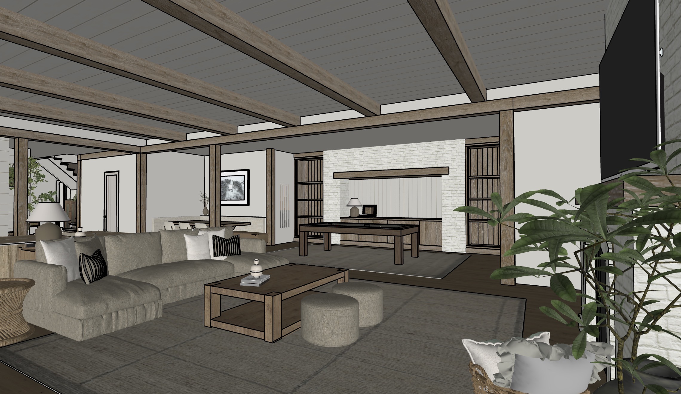 create a beautifully rendered living room interior with a cozy inviting atmosphere use earthy tones and natural textures throughout highlight the wooden ceiling beams with a rich warm oak color the walls should be a soft creamy white the sofa is a plush taupe fabric adorned with a mix of white and black throw pillows feature a rustic dark wood coffee table and matching side tables the flooring is a deep chocolate brown wood with a large textured gray area rug include lush green indoor plants for a touch of nature the lighting is warm and ambient casting soft glows throughout the room