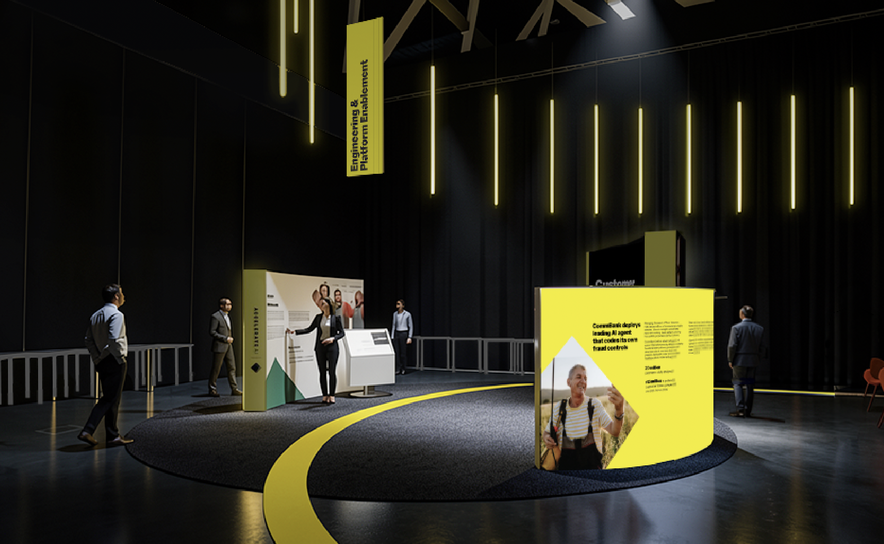 dimply lit modern expo room with a polished concrete floor that softly reflects light yellow grow coming from the curved walls in the centre of the space and reflects softly onto the floor