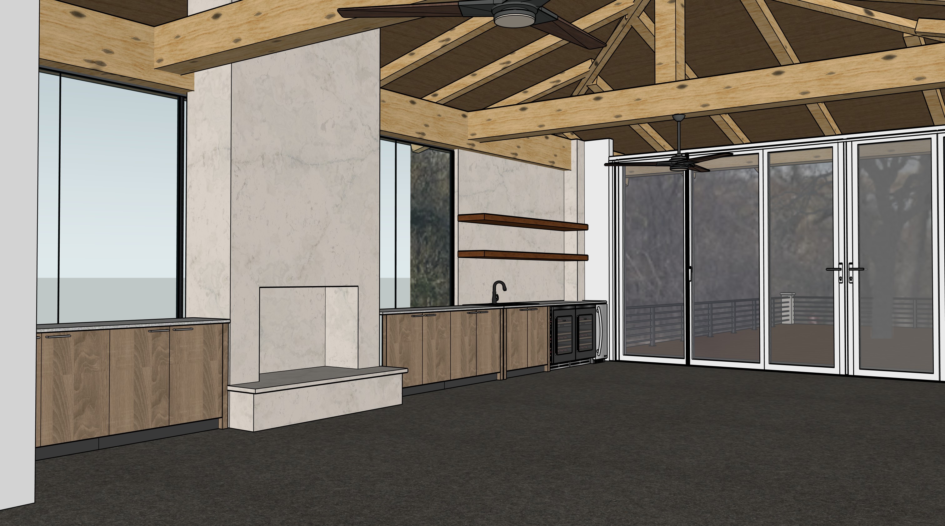 render pavilion with stained concrete floors cedar wood rafters and wood panel ceiling and wood soffit make window frames black deck and cable railing out back