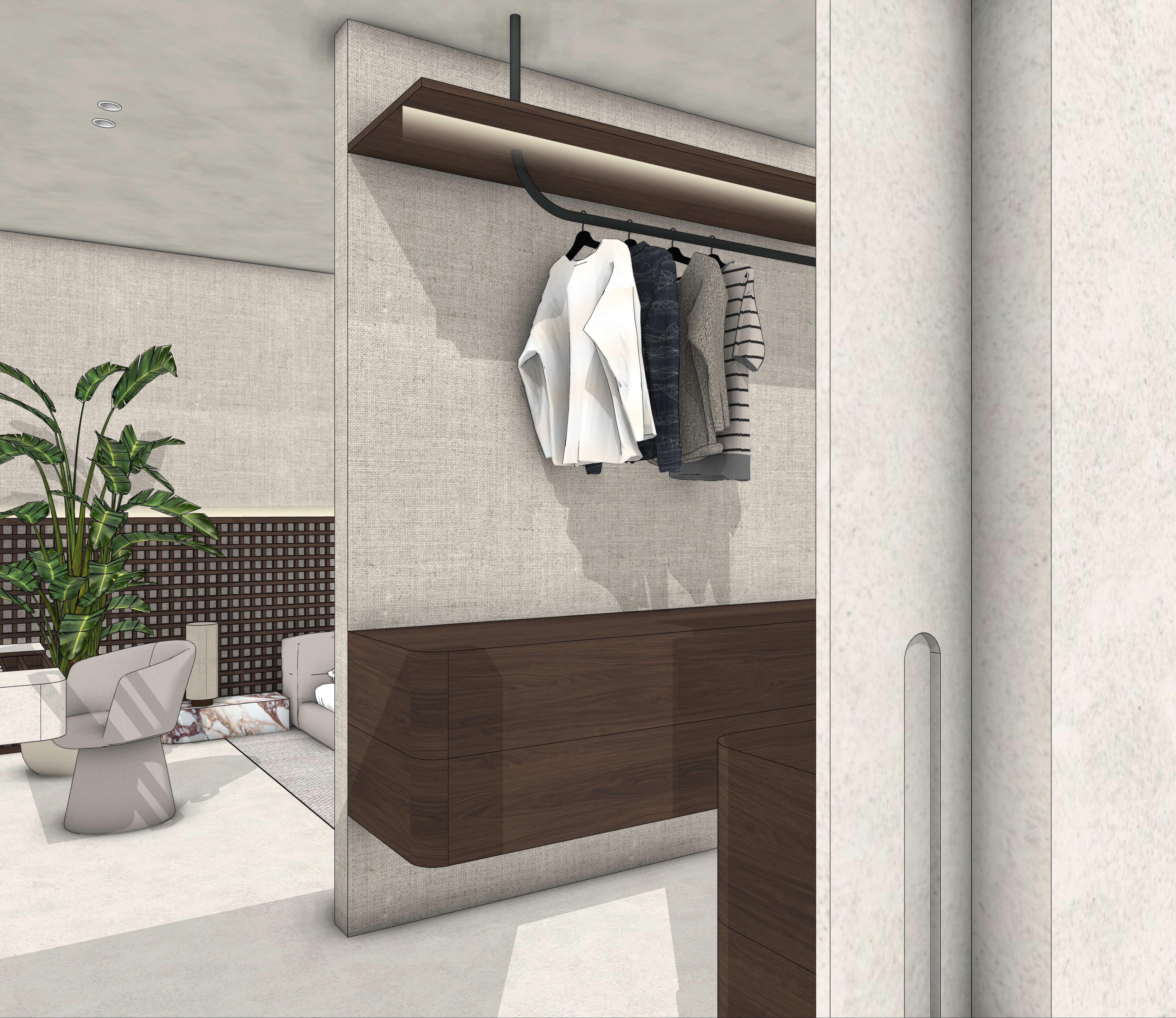 daylight microcement dark walnut wood off white